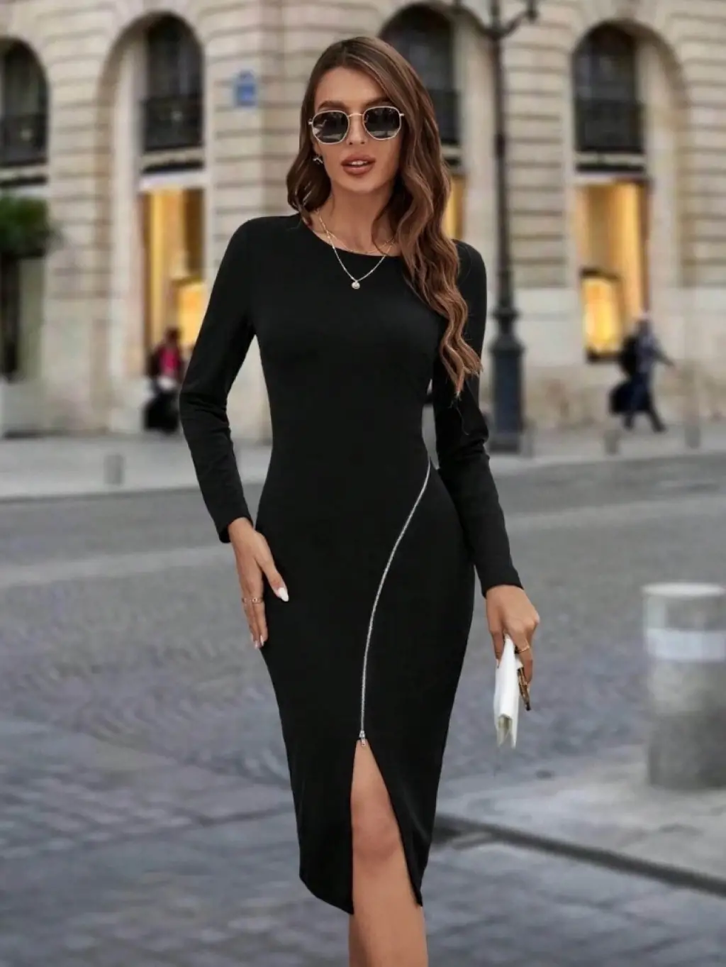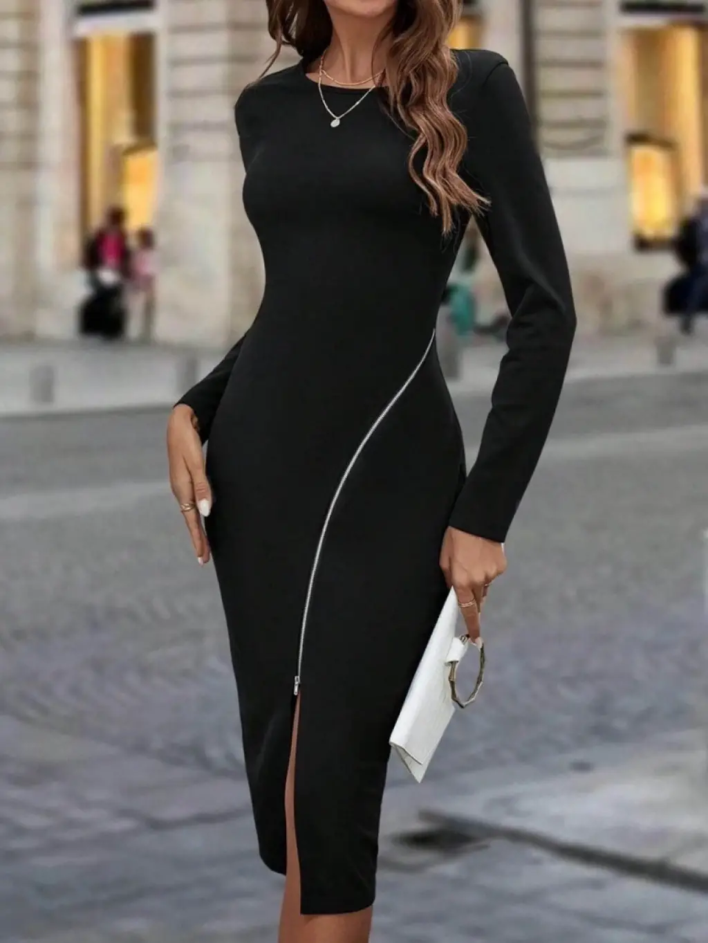 Kadın Uzun Kollu Bisiklet Yaka Fermuar Detaylı Yırtmaçlı Midi Krep Elbise