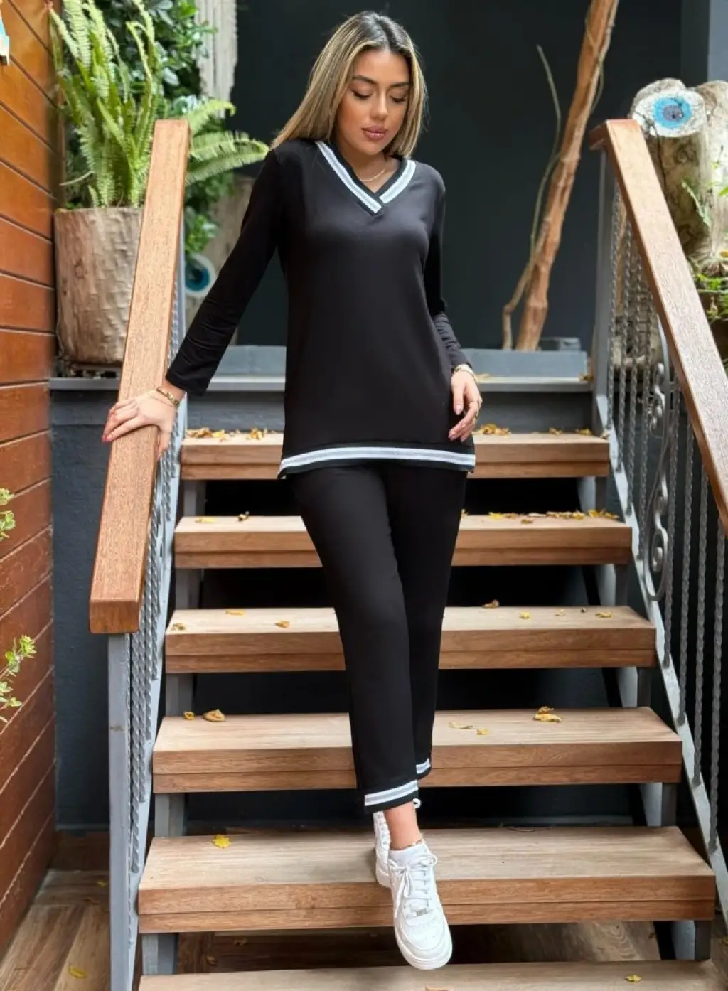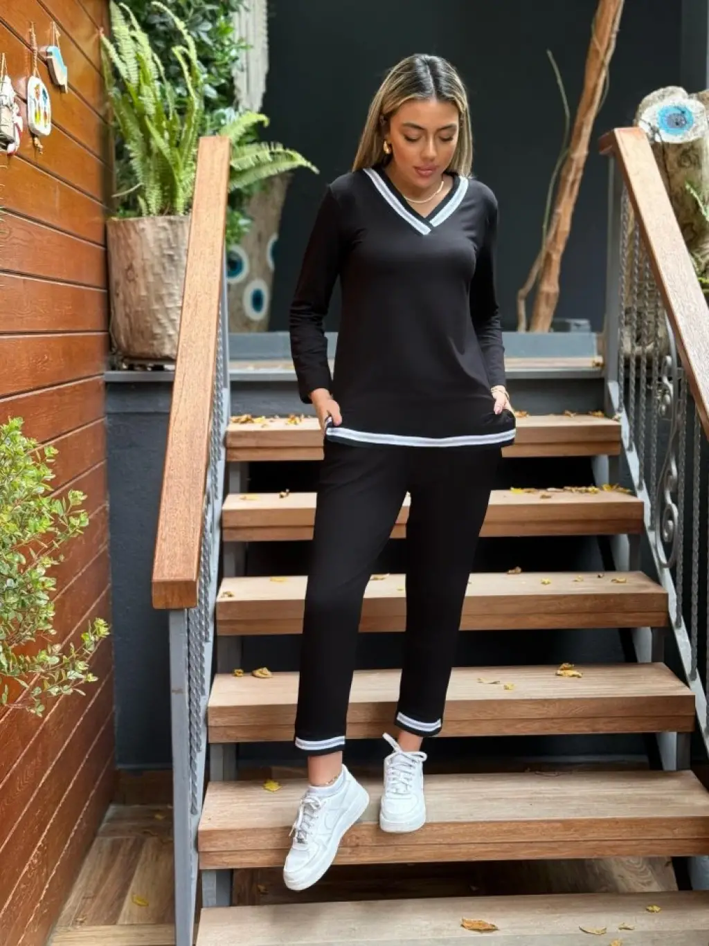 Kadın Uzun Kollu V Yakalı şerit Detay Alt Ve üst Viskon Iki Iplik Detay Ikili Takım