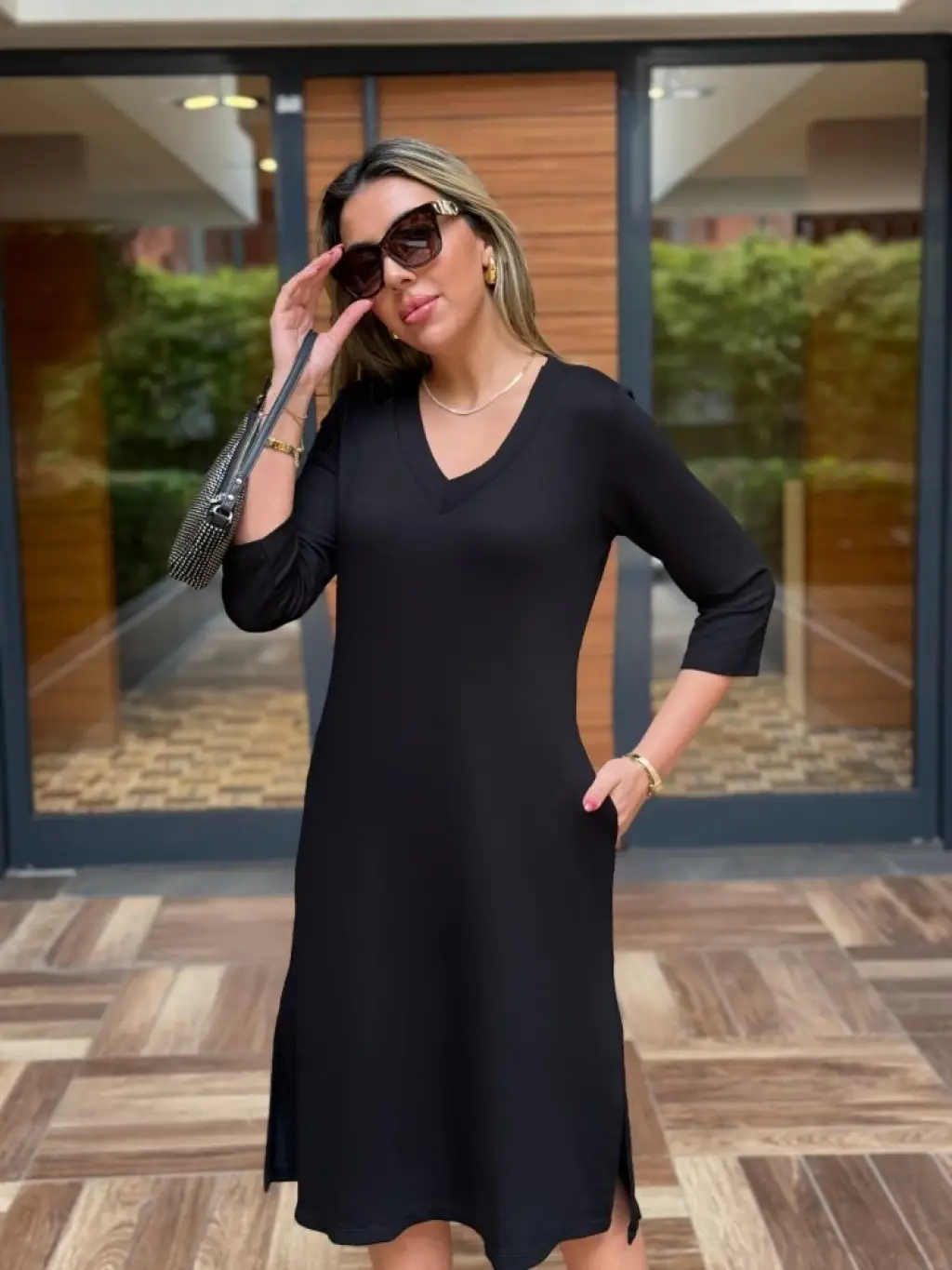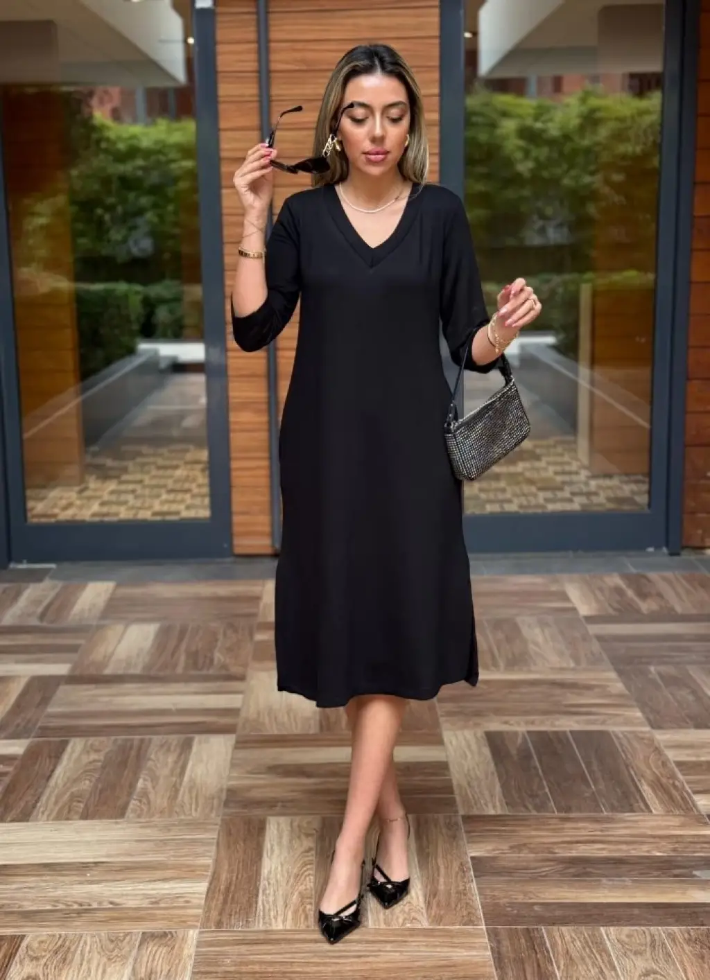 Kadın Uzun Kollu V Yakalı Yandan Yırtmaçlı Iki Iplik Midi Elbise