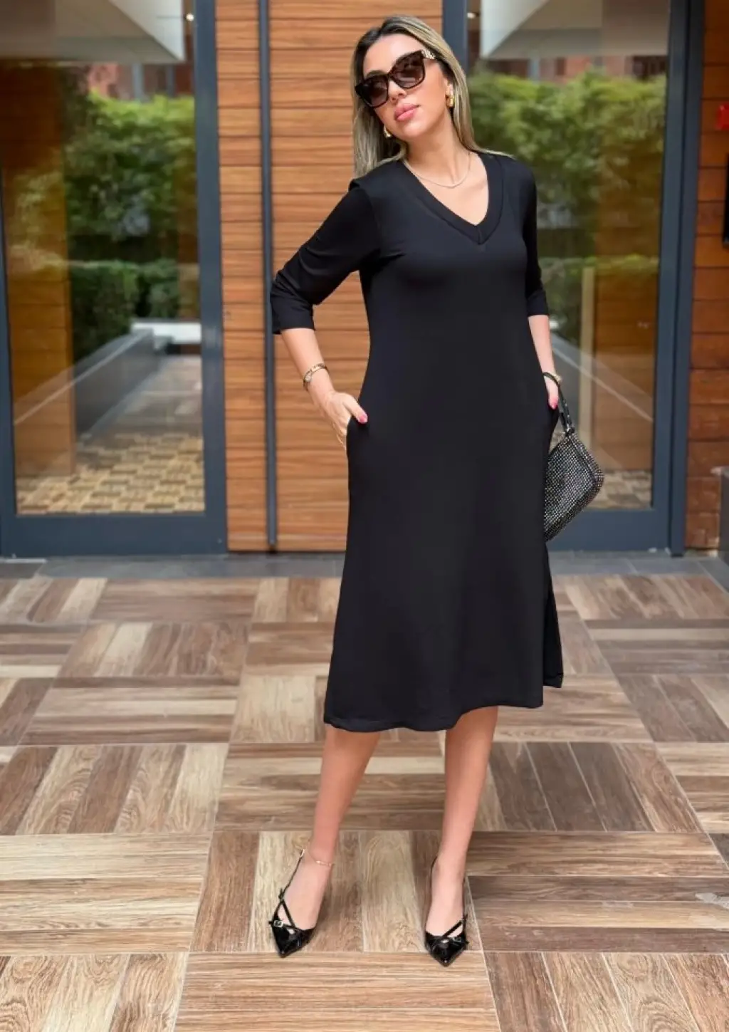 Kadın Uzun Kollu V Yakalı Yanlardan Yırtmaçlı Viskon Iki Iplik Midi Elbise