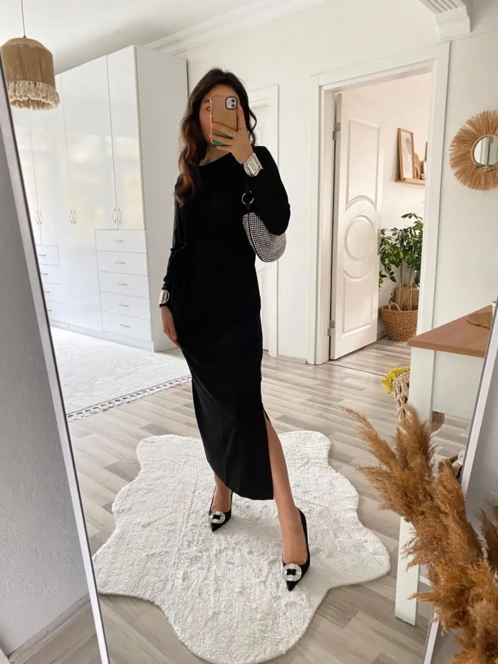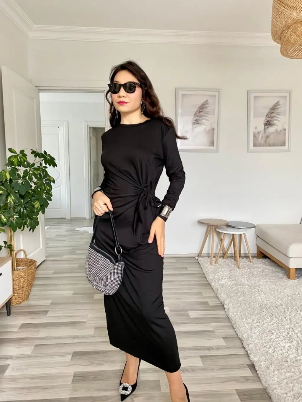 Kadın Uzun Kollu Bisiklet Yaka Belden çapraz Bağlamalı Yandan Yırtmaçlı Uzun Viskon Iki Iplik Elbise