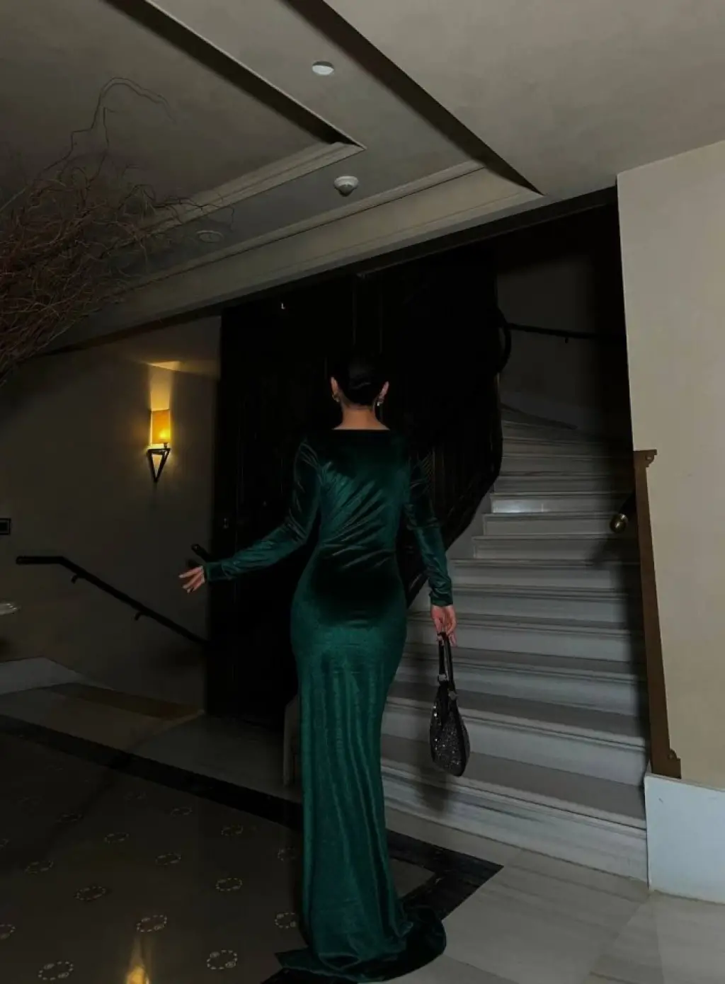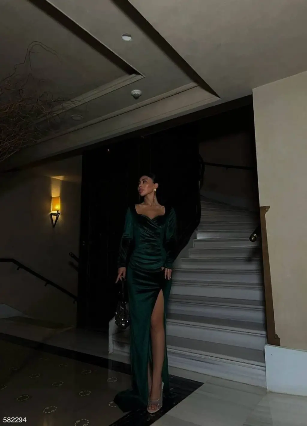 Kadın Kadife Kumaş Kalp Yaka Yırtmaç Detaylı Maxi Boy Elbise