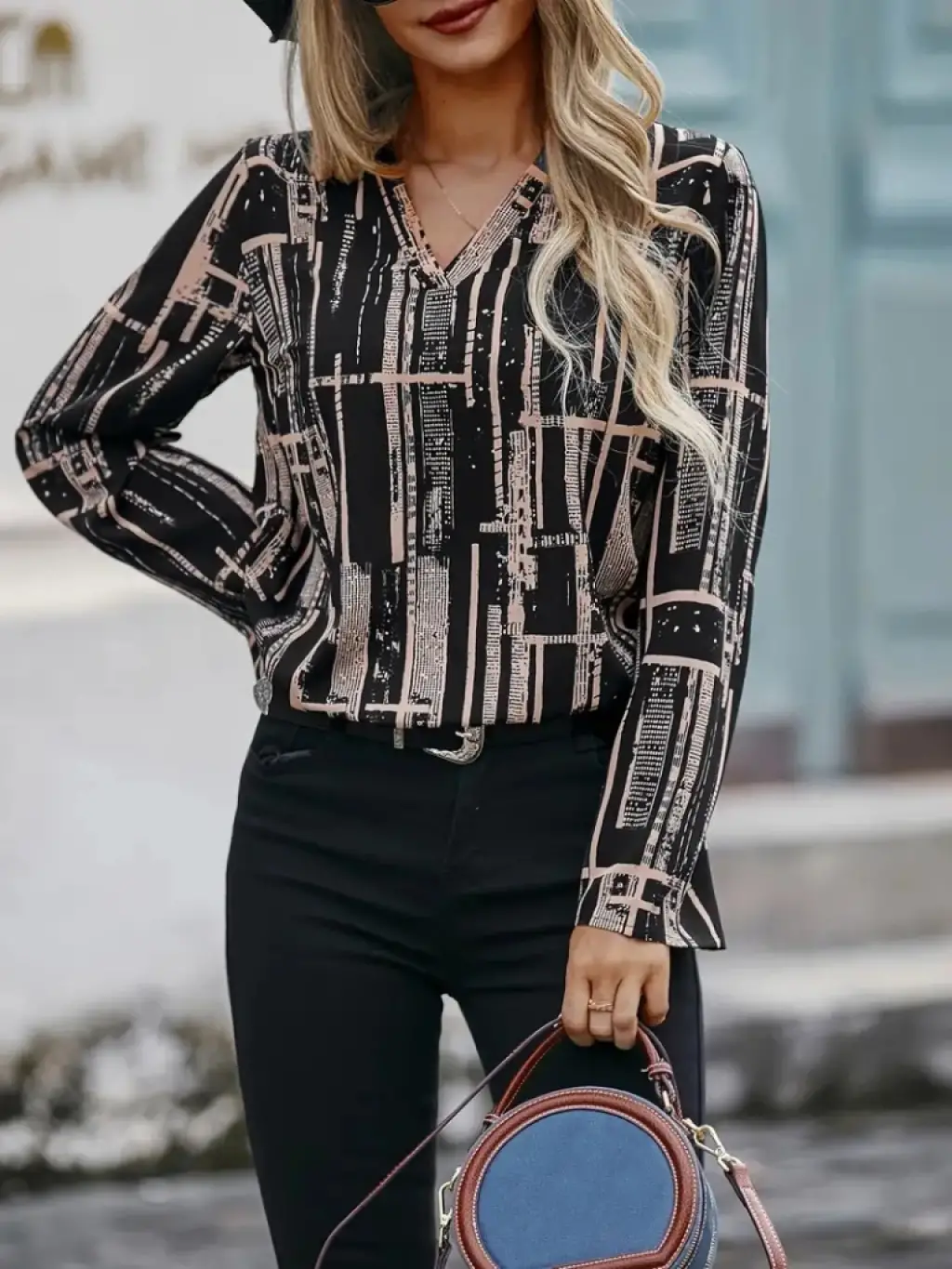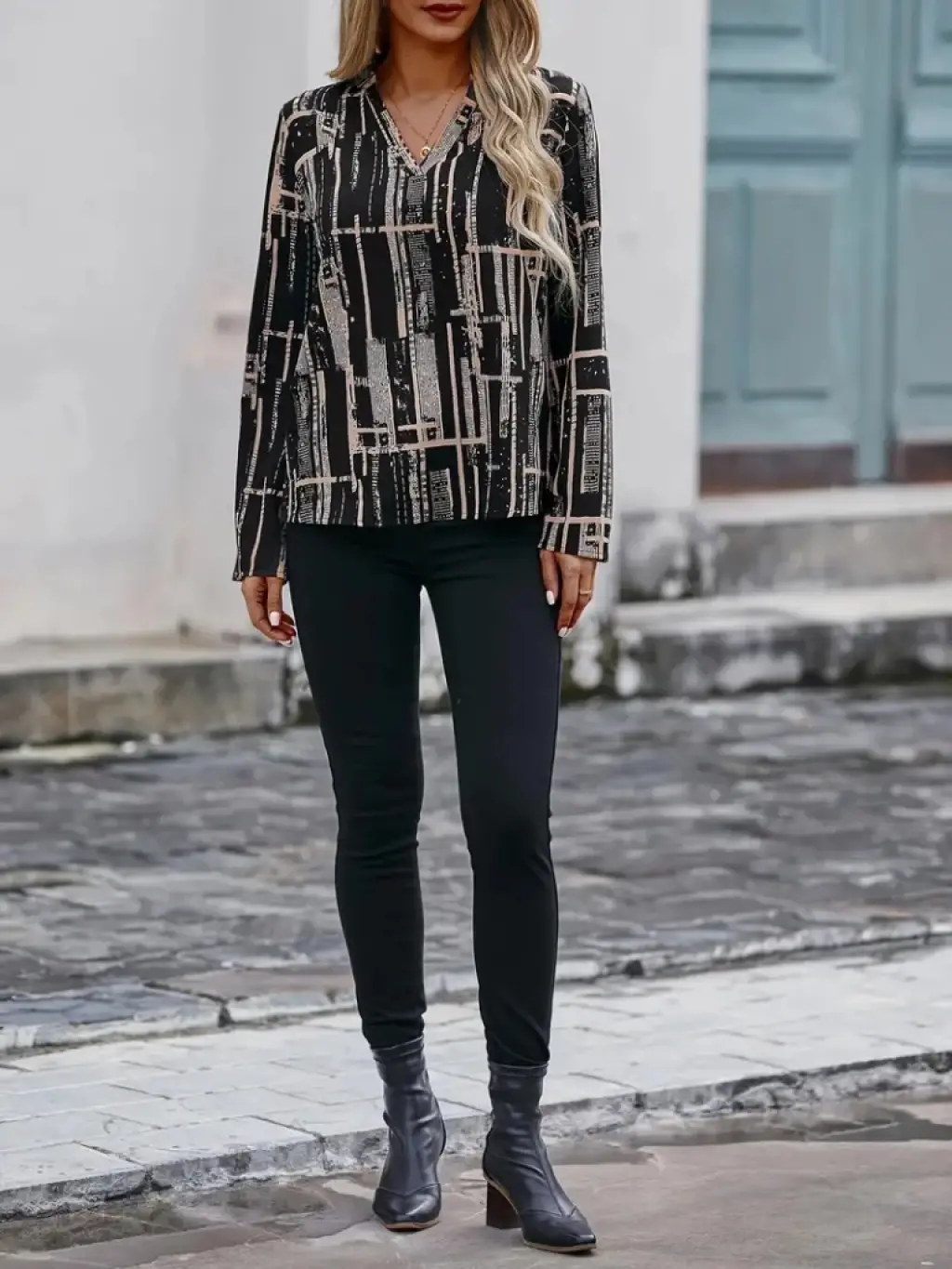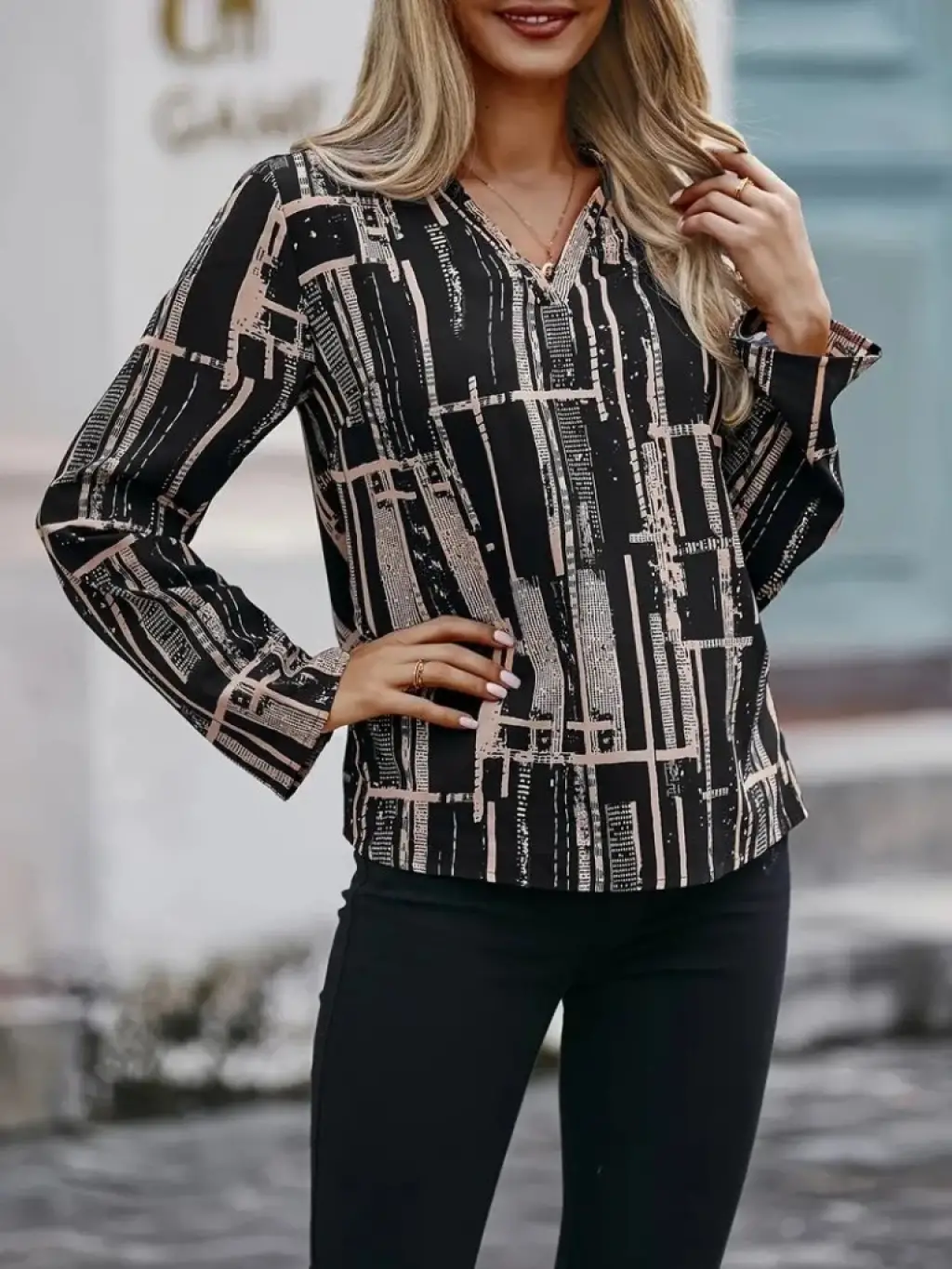 Kadın Uzun Kollu V Yakalı Desenli Dalgıç Bluz