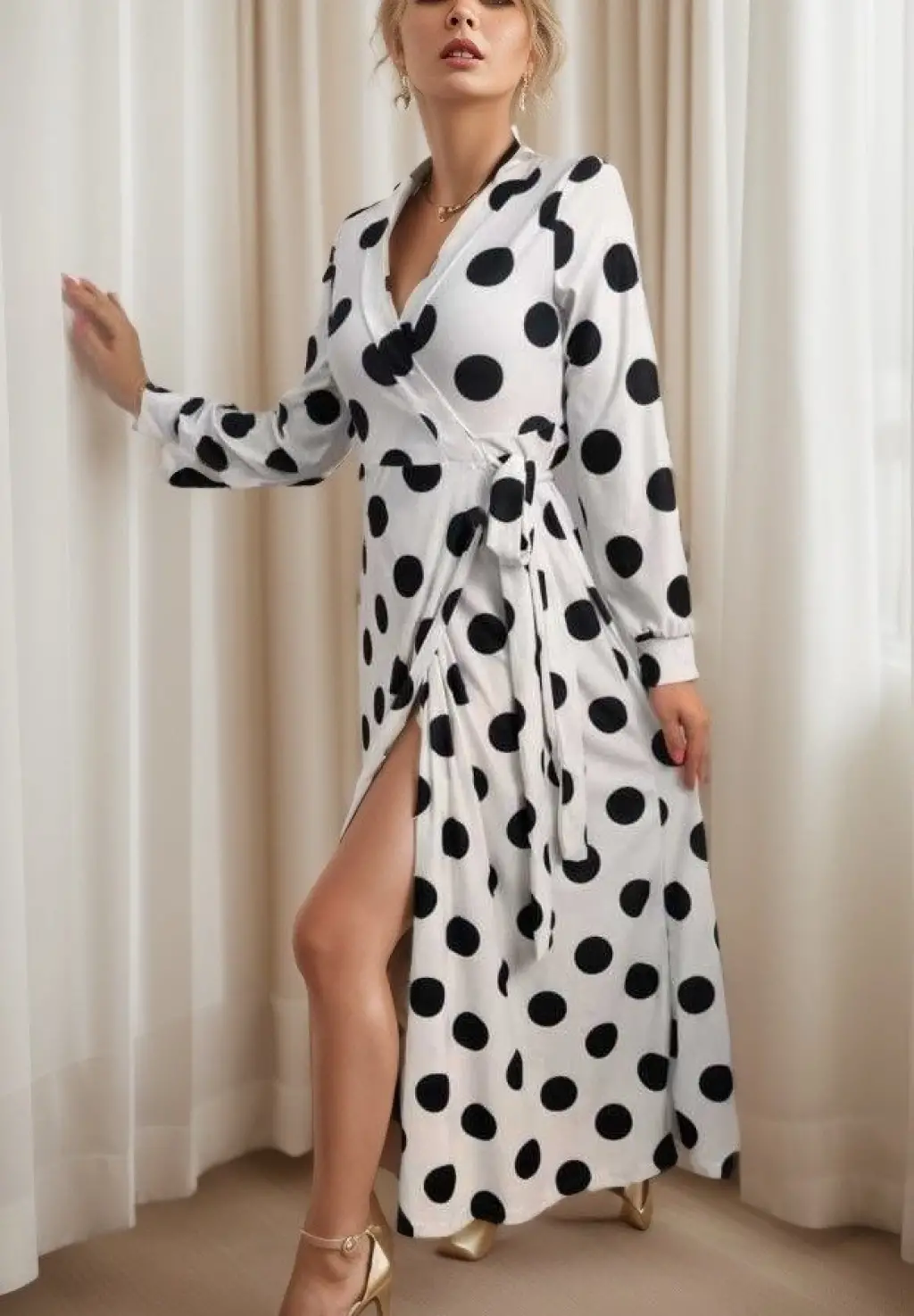 Kadın Uzun Kollu Kruvaze Yaka Yandan Bağlamalı Krep Tam Boy Elbise