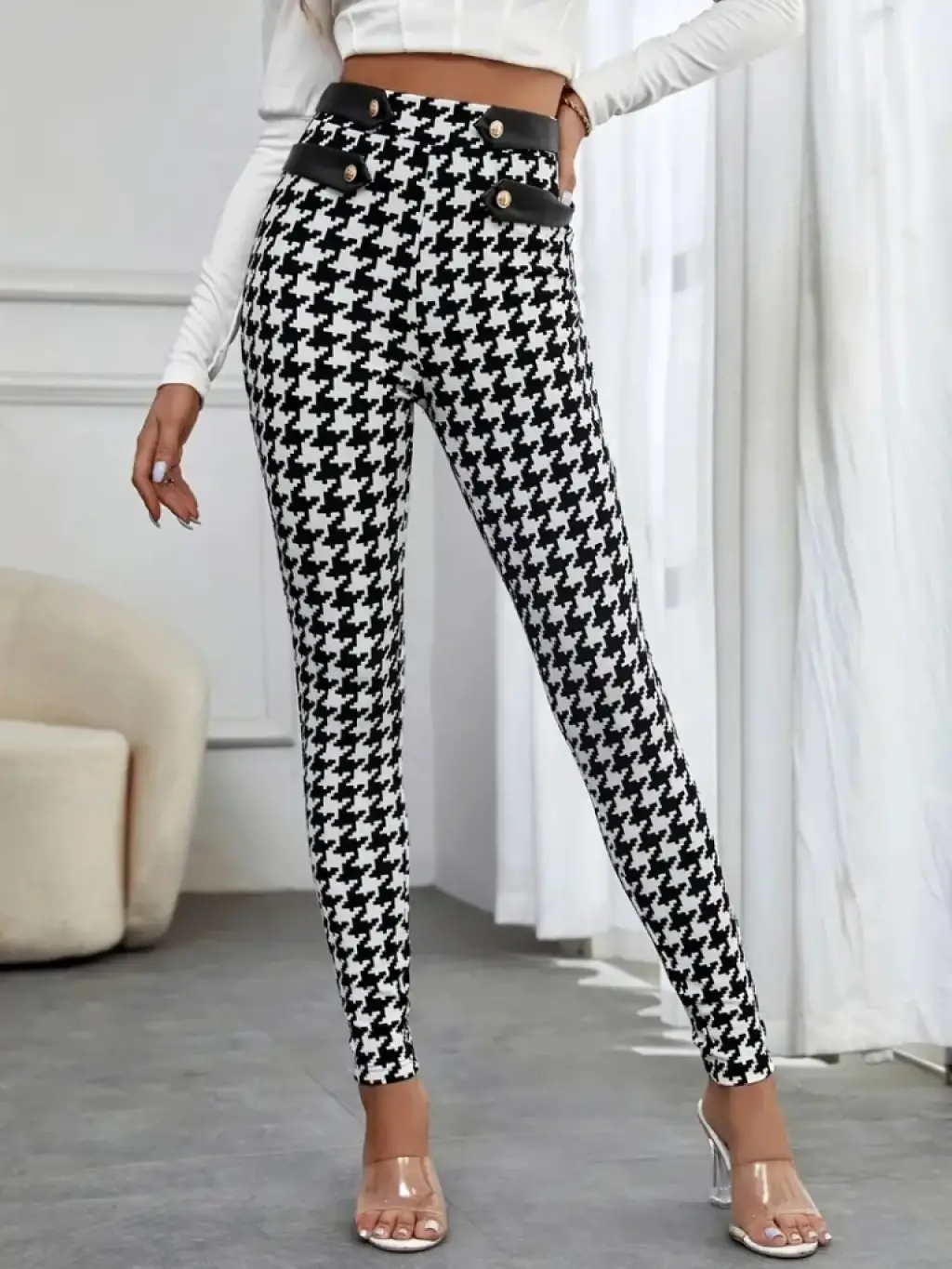 Kadın Yüksek Bel Kaz Ayağı Desenli Yan şerit Düğme Detaylı Dalgıç Pantolon
