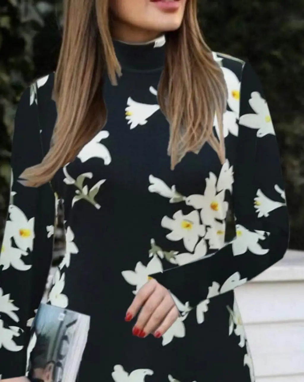 Kadın Balıkçı Yaka Uzun Kollu çiçek Desenli Krep Elbise