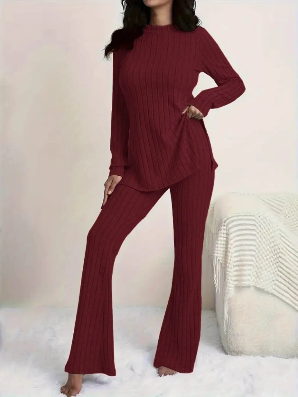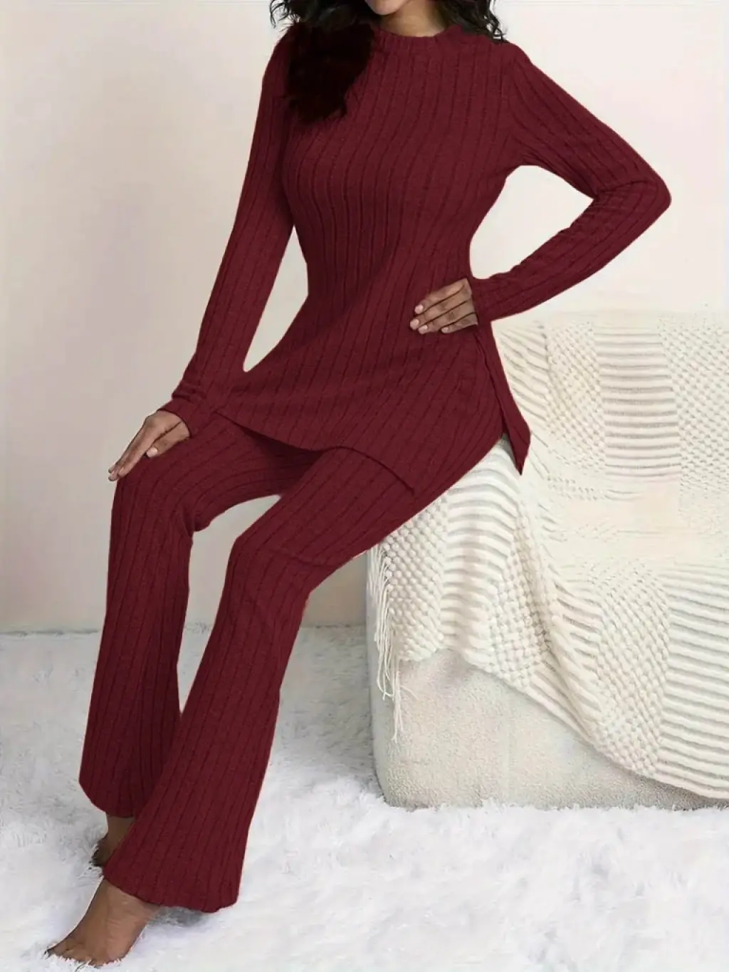 Kadın Uzun Kollu Yuvarlak Yaka Yandan Yırtmaç Detaylı şardonlu Kaşkorse Bluz Ve Pantolon Ikili Takım