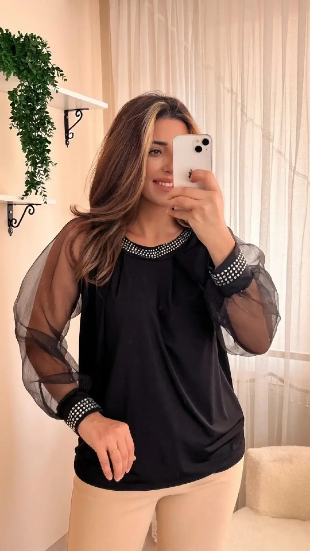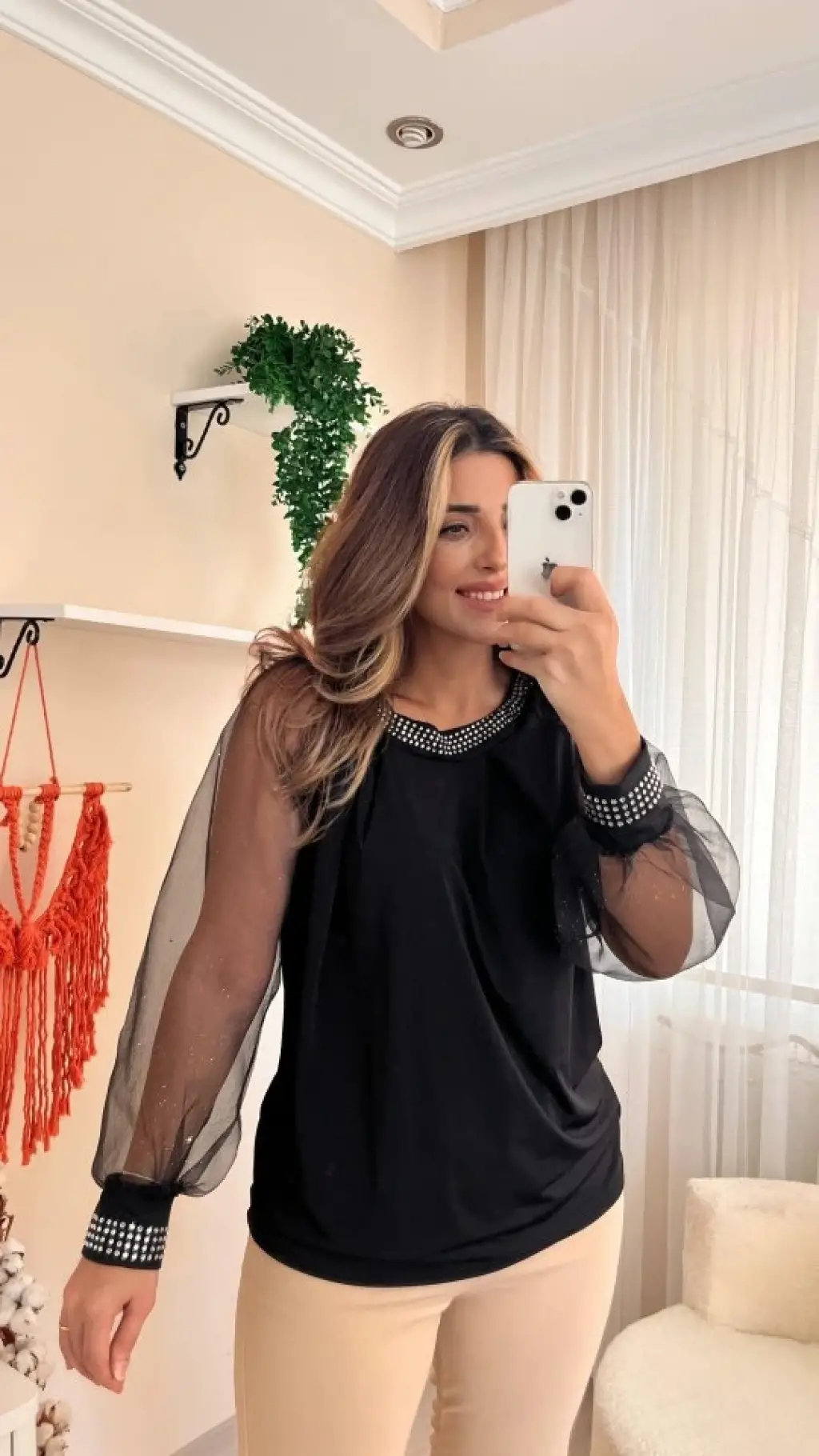 Kadın Uzun Kollu Bisiklet Yaka Taşlı Kol Tül Detaylı Sandy Bluz