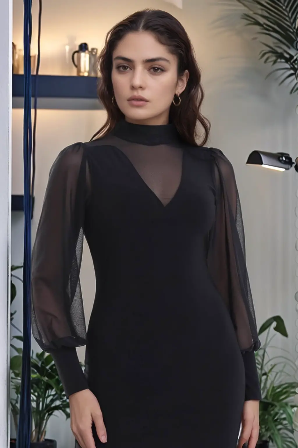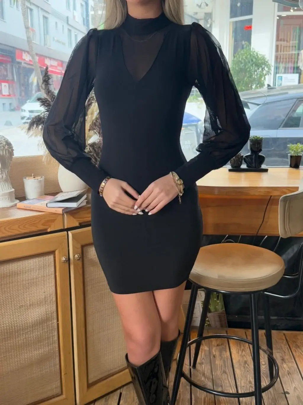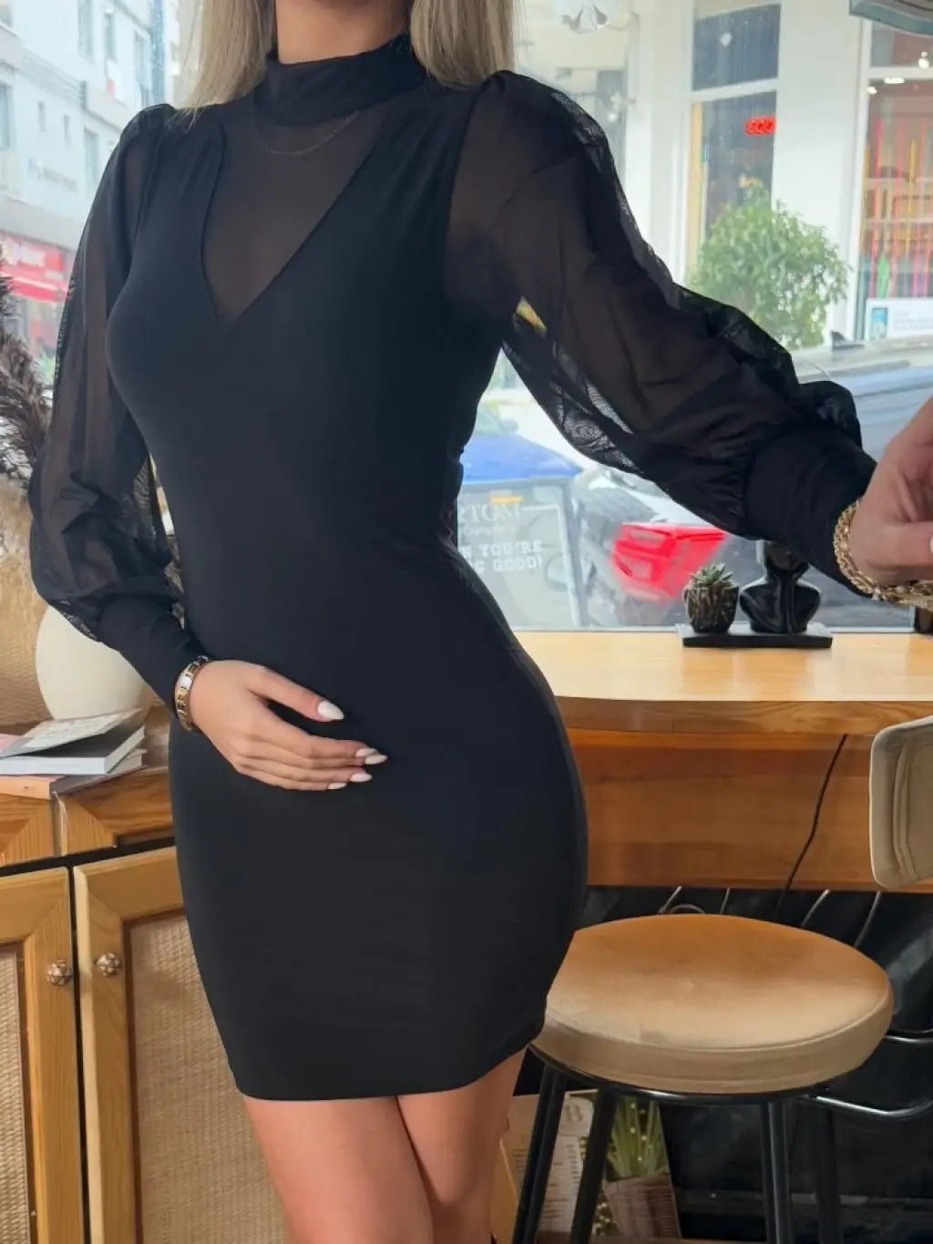 Kadın Balıkçı Yaka Transparan Detay Fırsat ürün Sandy Kumaş Mini Elbise