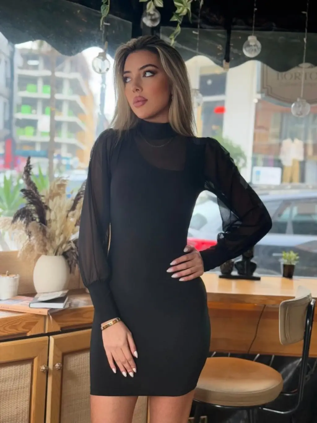 Kadın Balıkçı Yaka Transparan Detay Fırsat ürün Sandy Kumaş Mini Elbise