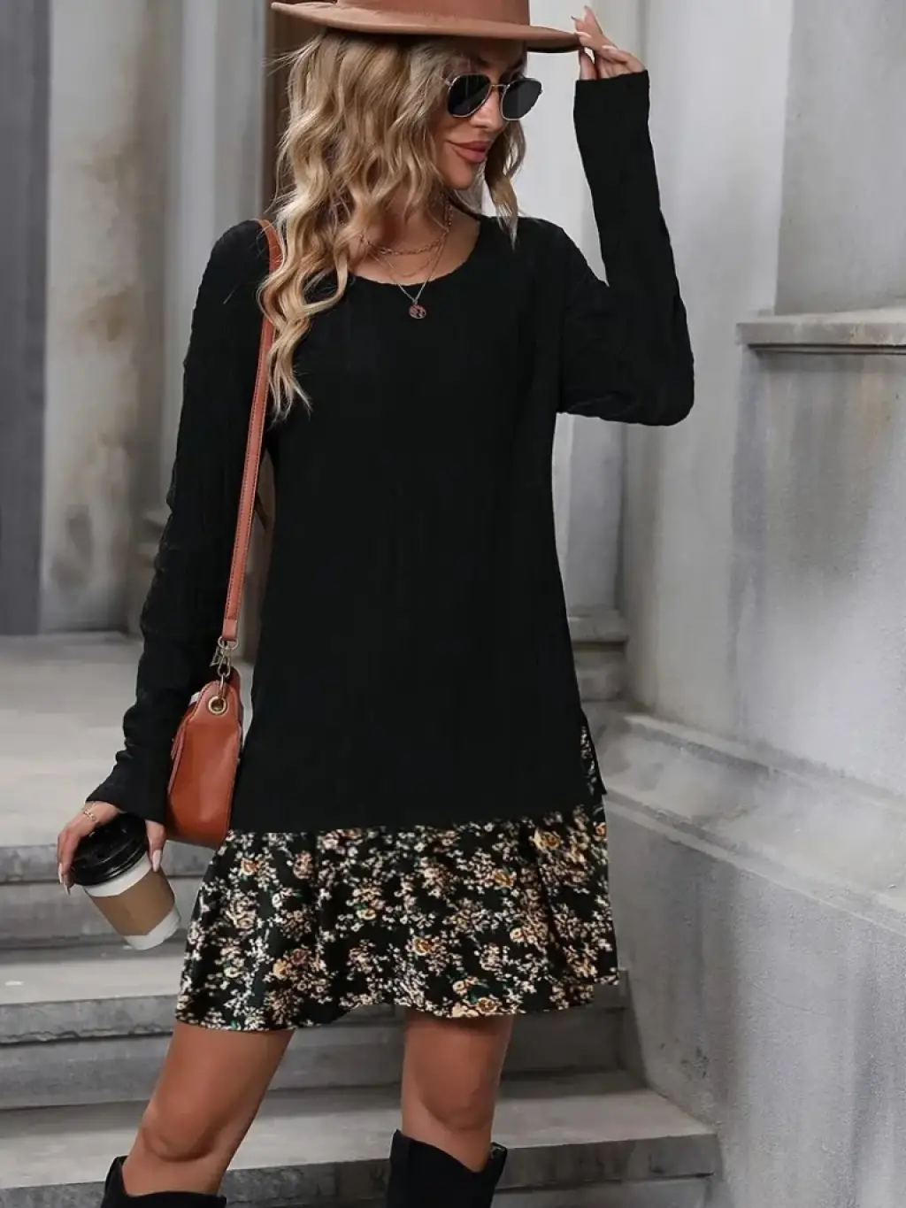 Kadın Uzun Kollu üst Viskon Alt Kloş Deri Elbise