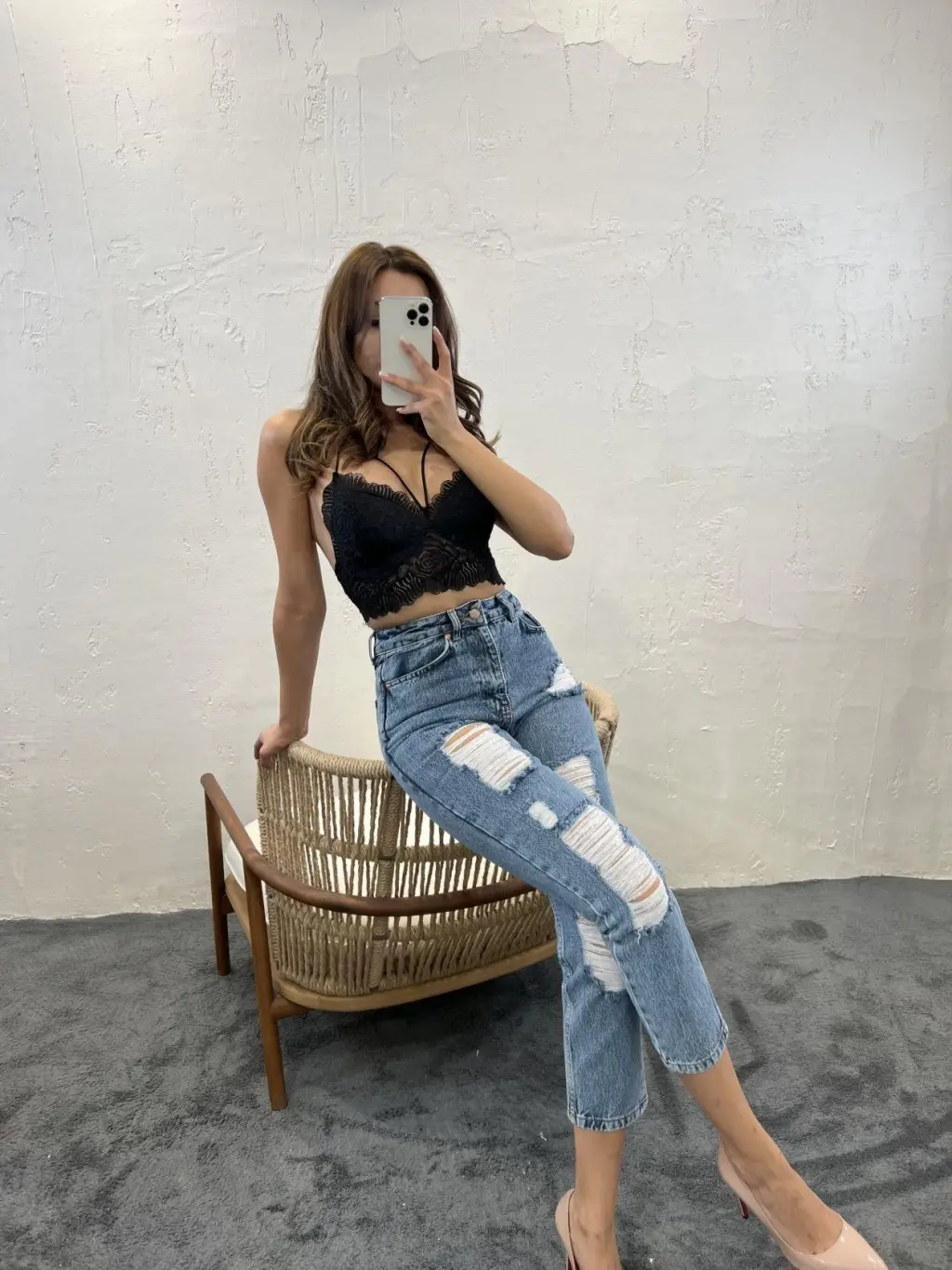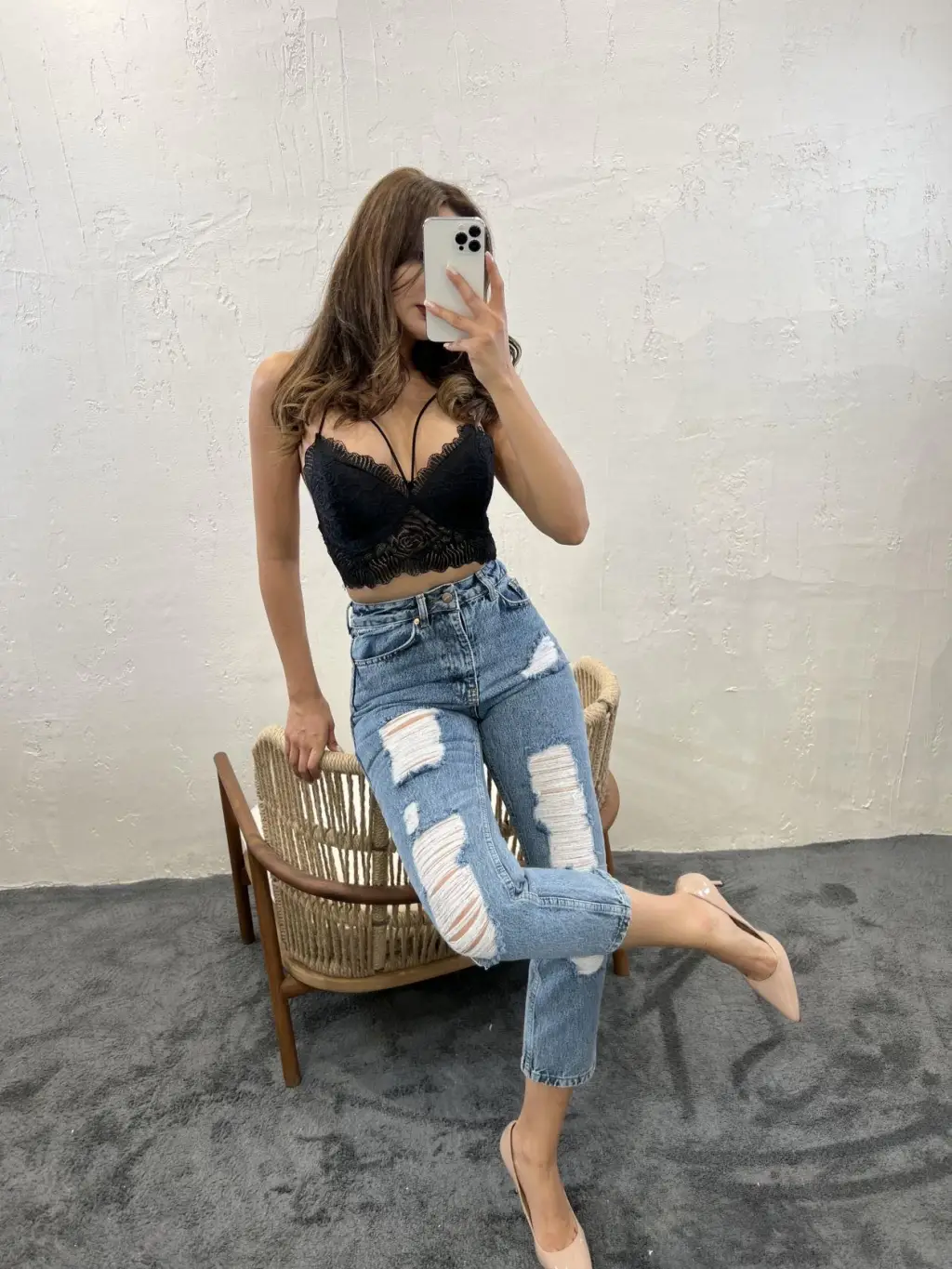 Kadın Uzun Lazer Kesik Detaylı Askılı Viskon Iki Iplik Bluz