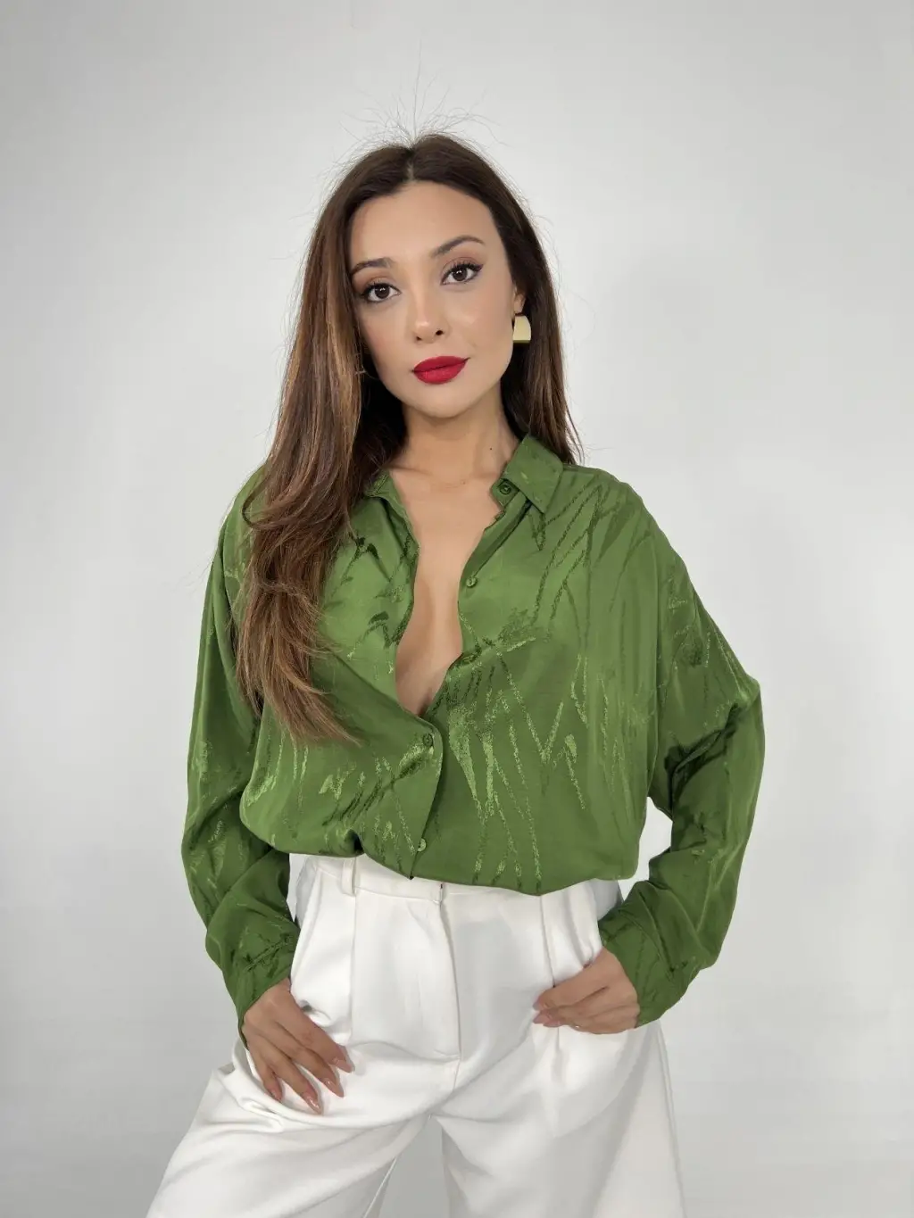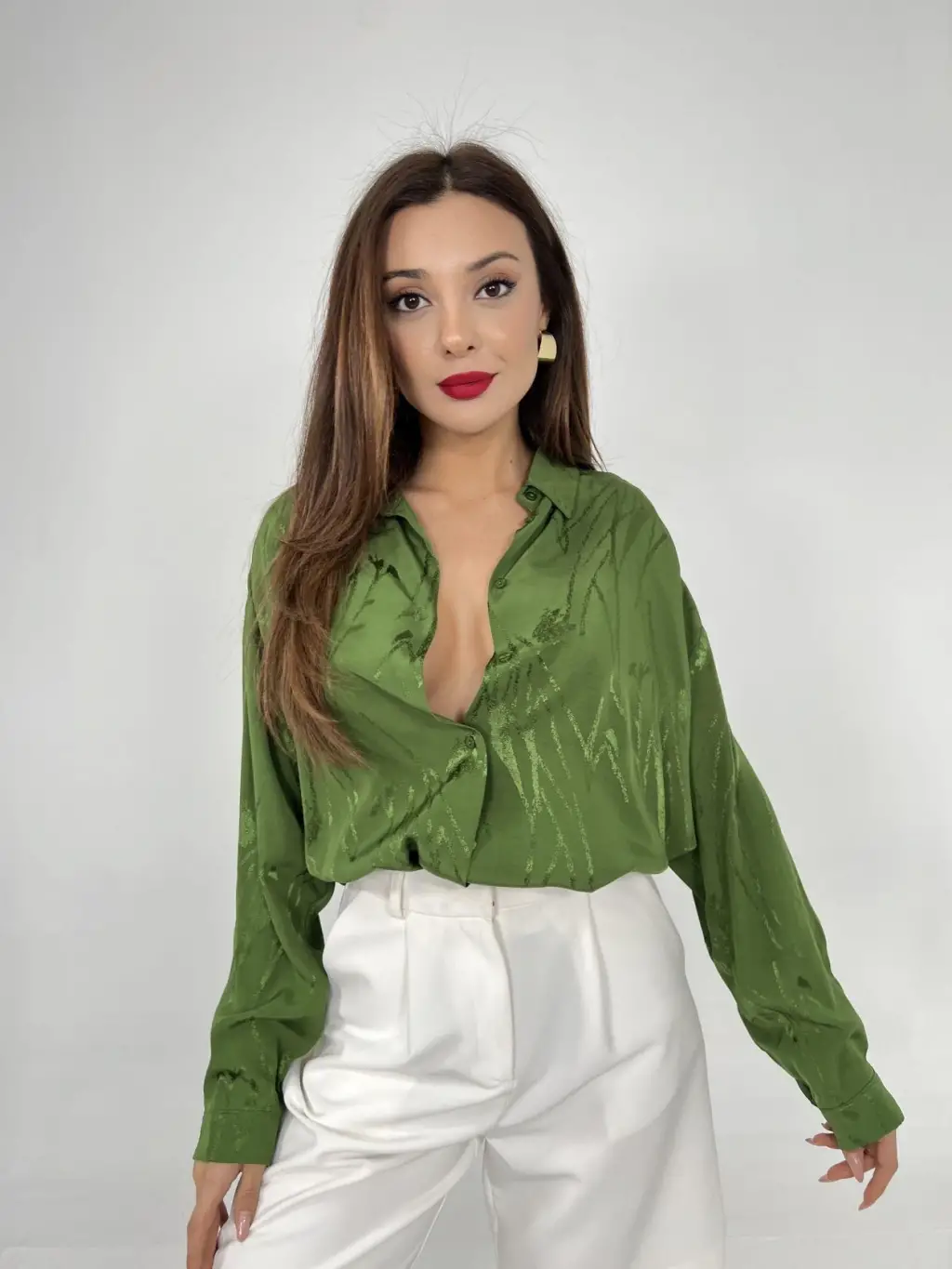 Kadın Uzun Kollu Balıkçı Yaka önden Düğmeli Bluz Ve Pantolon Yumoş Ikili Takım
