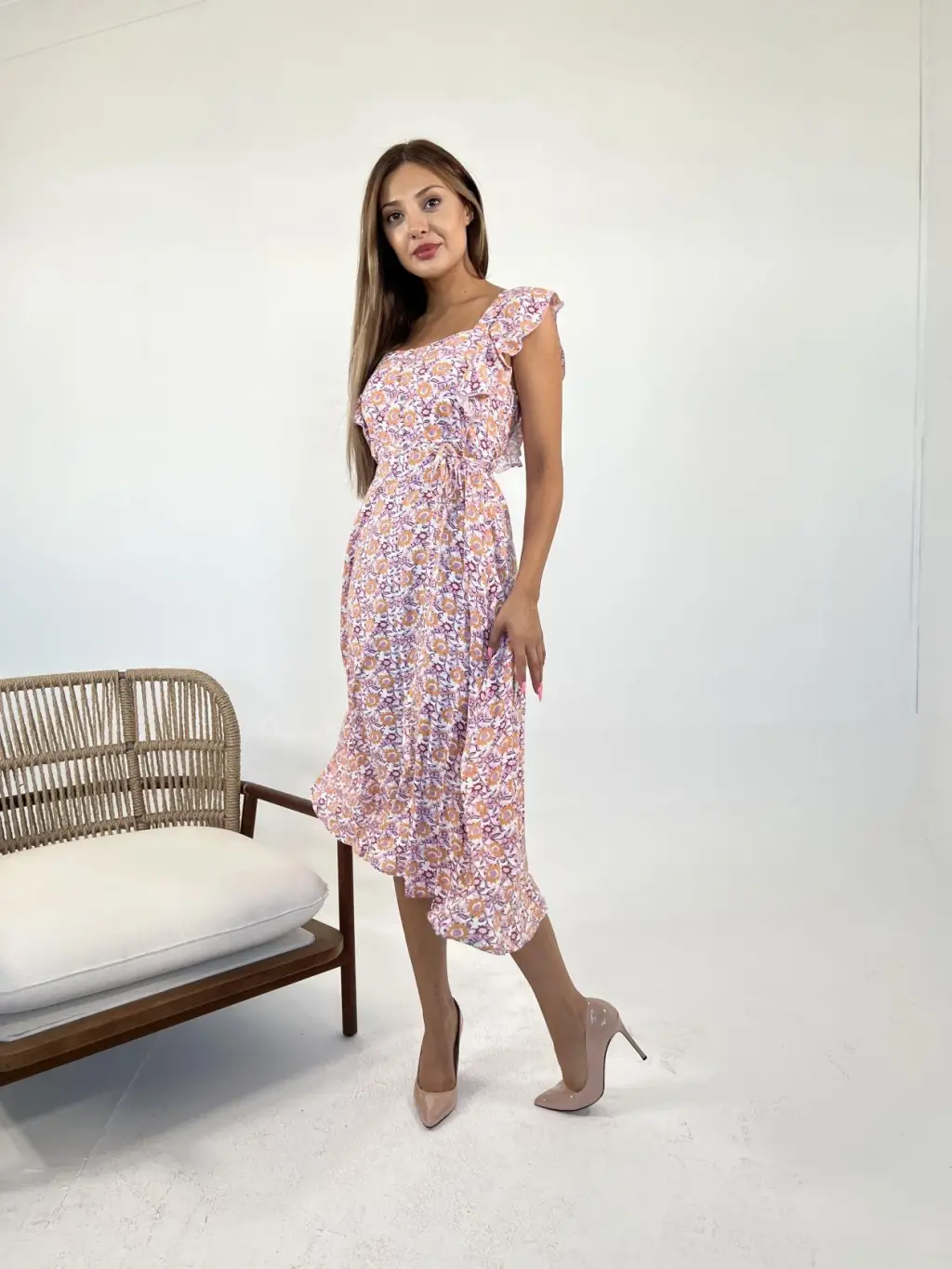 Kadın Askılı Kruvaze Yakalı Fırfırlı Janjan Krep Elbise