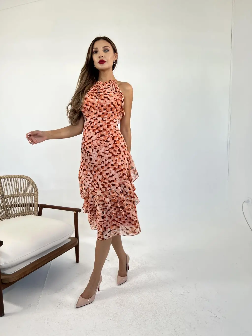 Kadın Askılı Kruvaze Yakalı Fırfırlı Janjan Krep Elbise