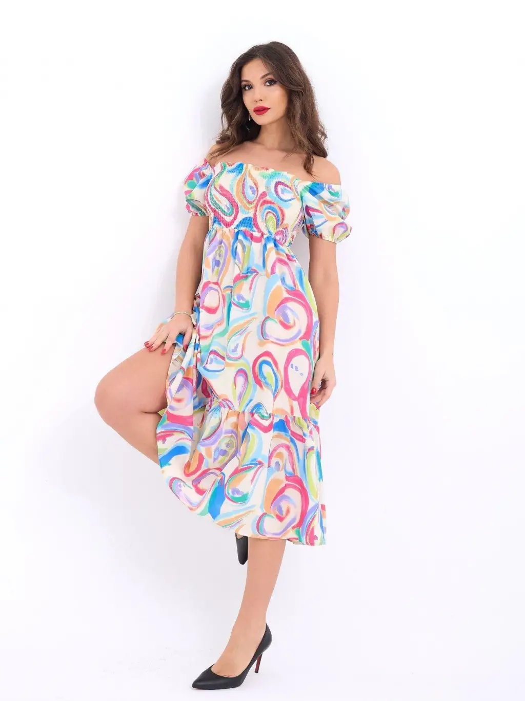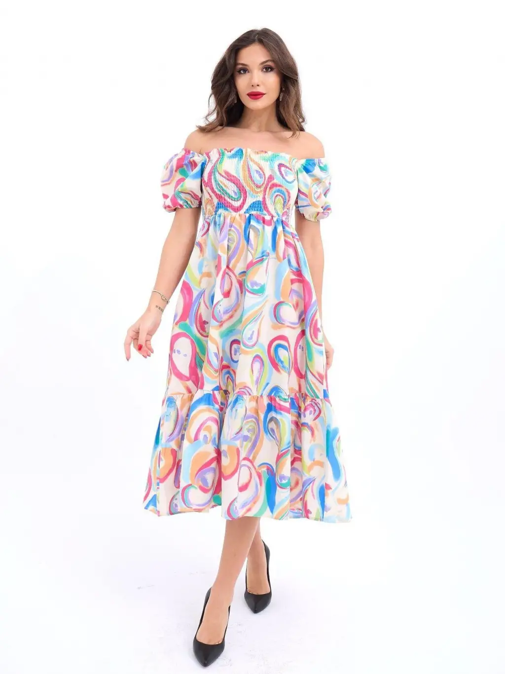 Kadın Kısa Kollu Madonna Yaka önü Kısa Arkası Uzun Ithal Krep Elbise