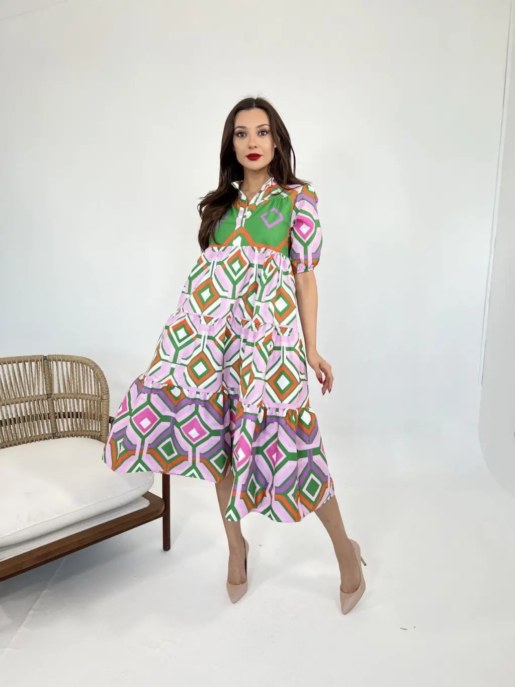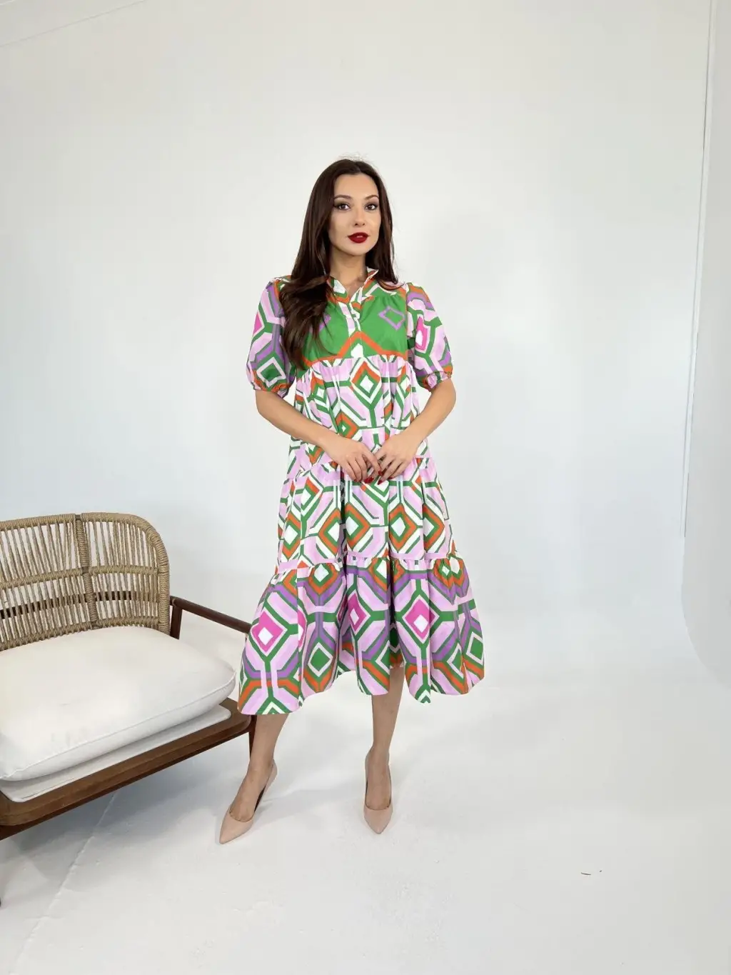 Kadın Kısa Kollu Yakadan Ve Etekten Fermuarlı Midi Viskon Iki Iplik Elbise