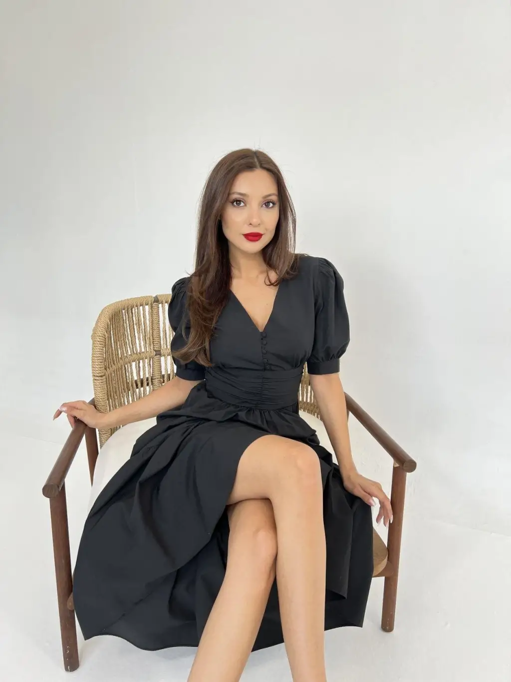 Kadın Kısa Kollu Yakadan Ve Etekten Fermuarlı Midi Viskon Iki Iplik Elbise