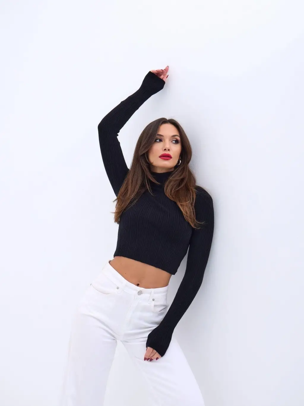 Kadın Uzun Kollu Balıkçı Yaka önden şerit Detay Dalgıç Bluz