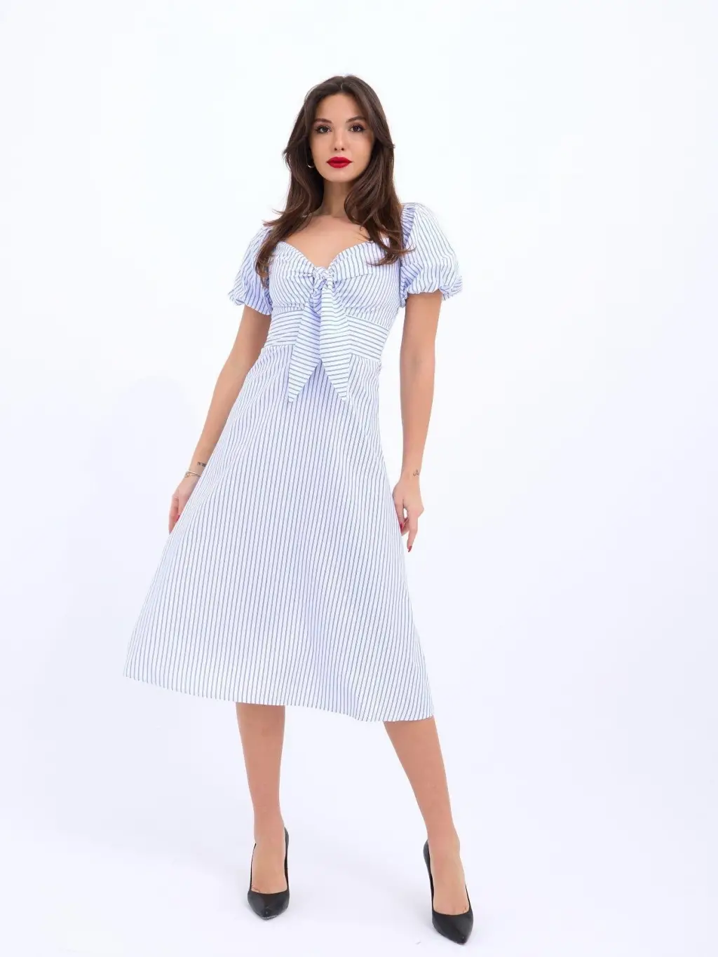 Kadın Kısa Kollu V Yakalı çizgi Baskılı Süprem Elbise