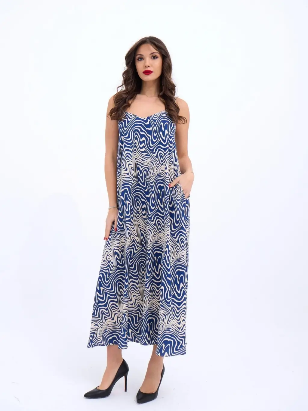 Kadın Ip Askılı Yuvarlak Yakalı Cepli Uzun Viskon Elbise