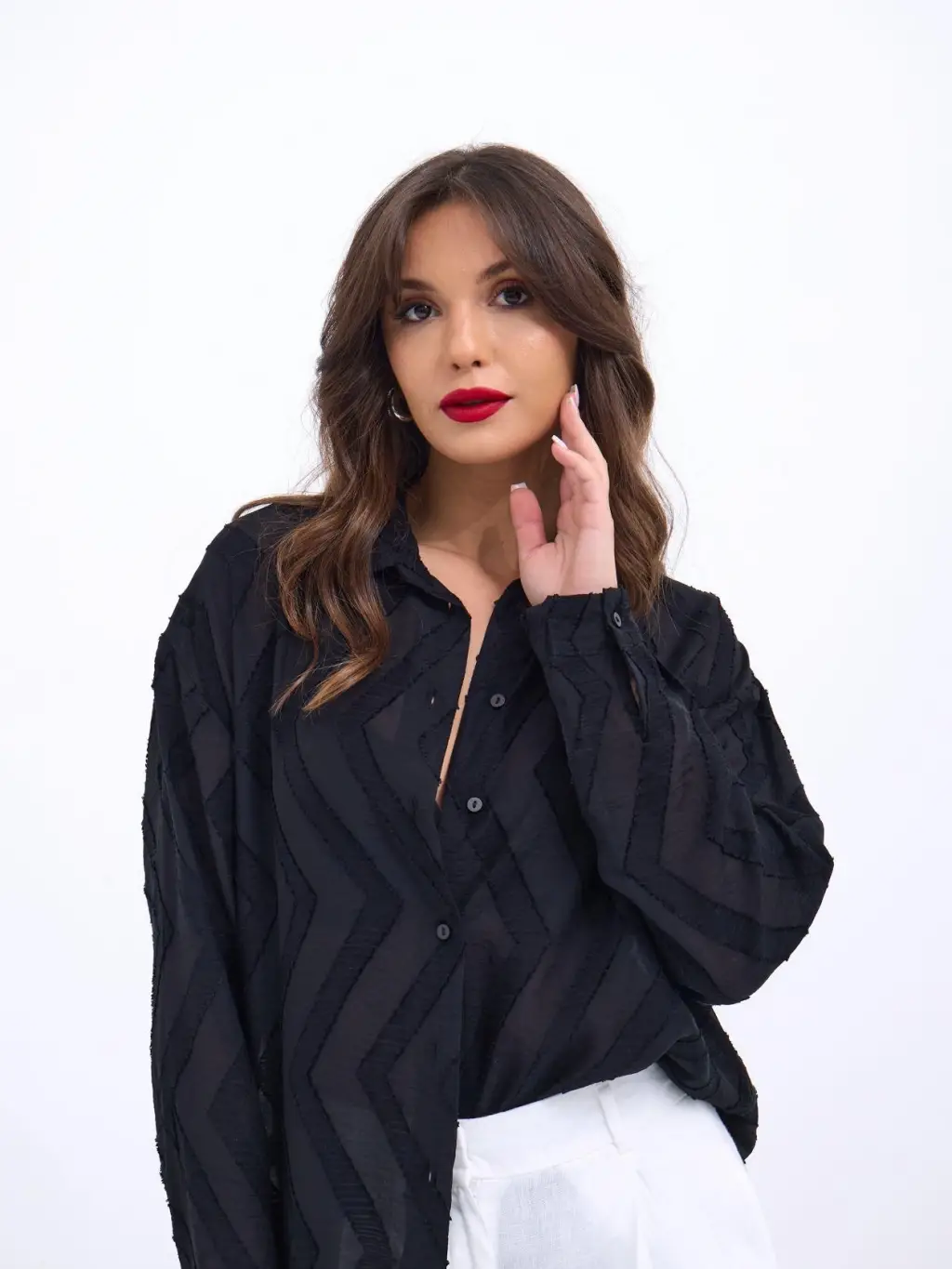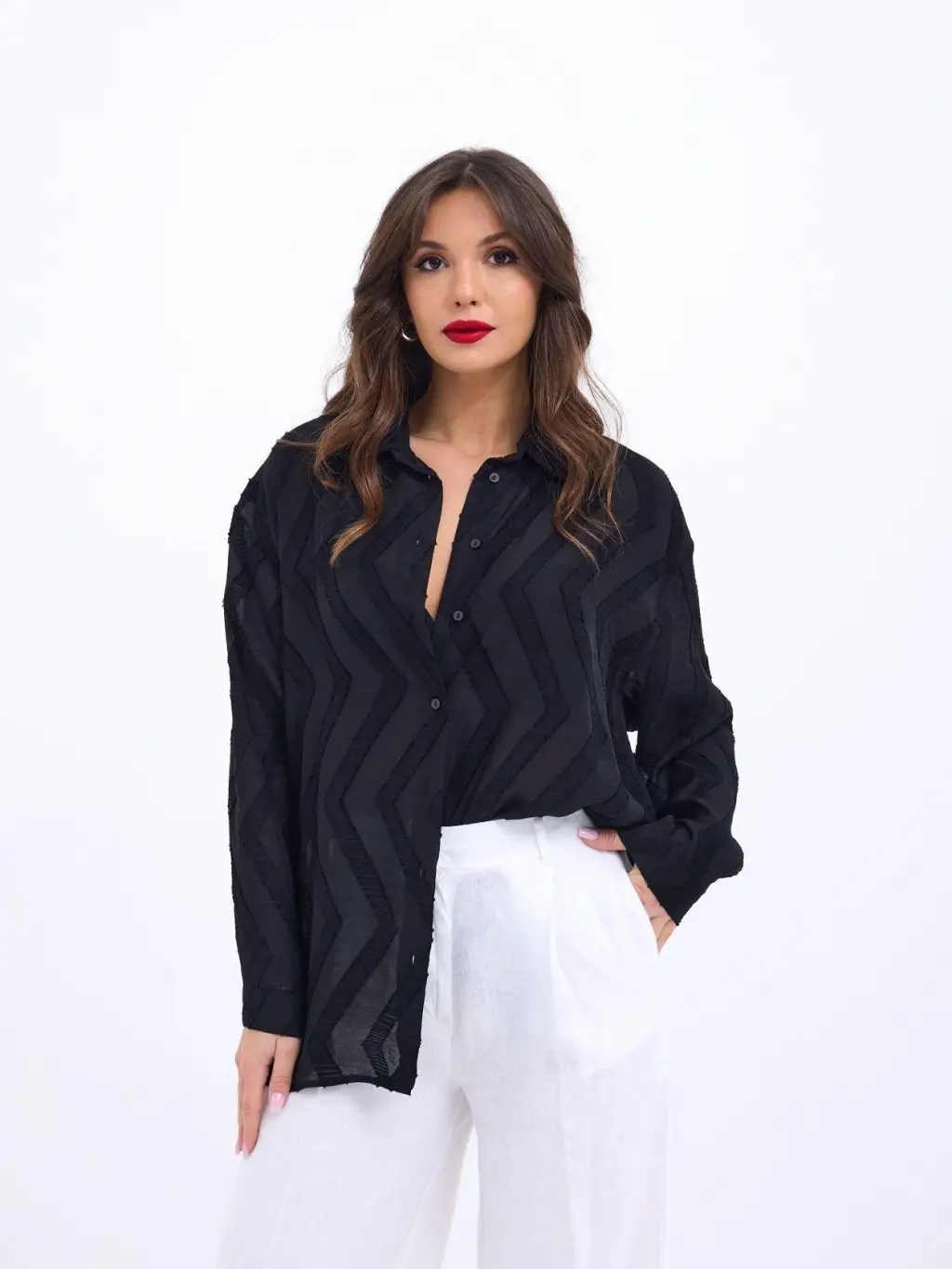 Kadın Uzun Kollu Hakim Yakalı önden Düğmeli Tül Detaylı Trikoton Gömlek