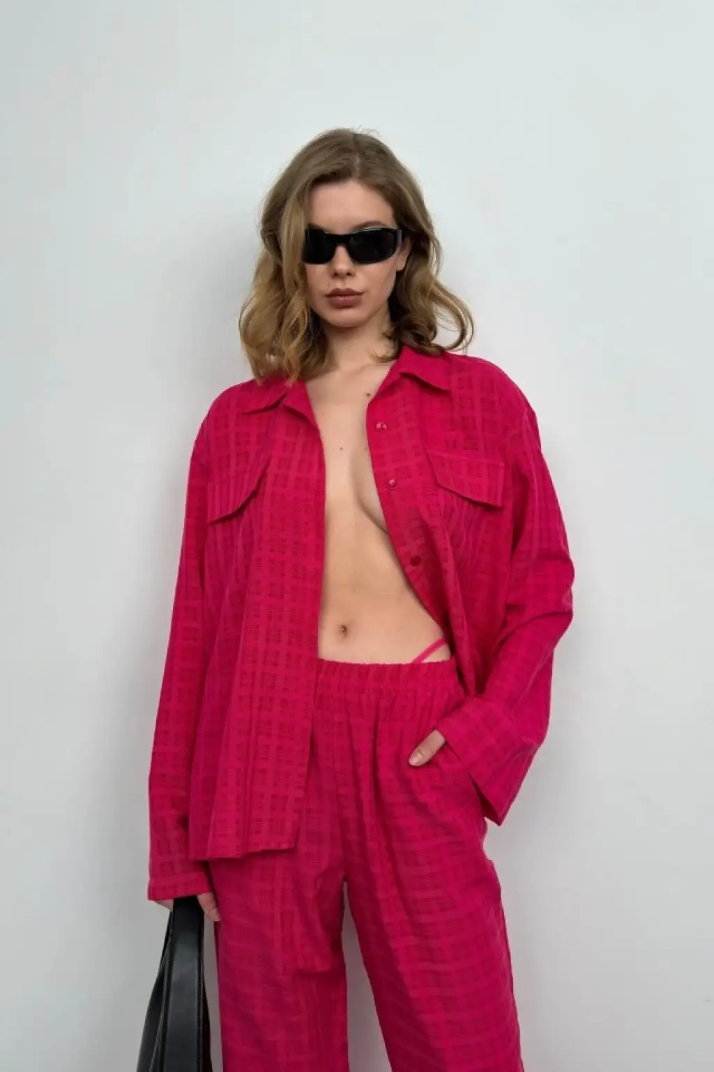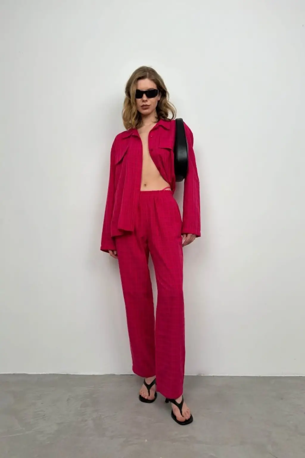 Kadın Uzun Kollu Balıkçı Yaka önden Düğmeli Bluz Ve Pantolon Yumoş Ikili Takım