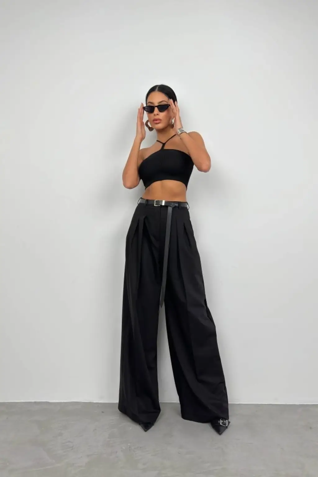 Uzun Kollu Önü İp Büzgülü Crop Ve Pantolon İkili Takım - Antrasit