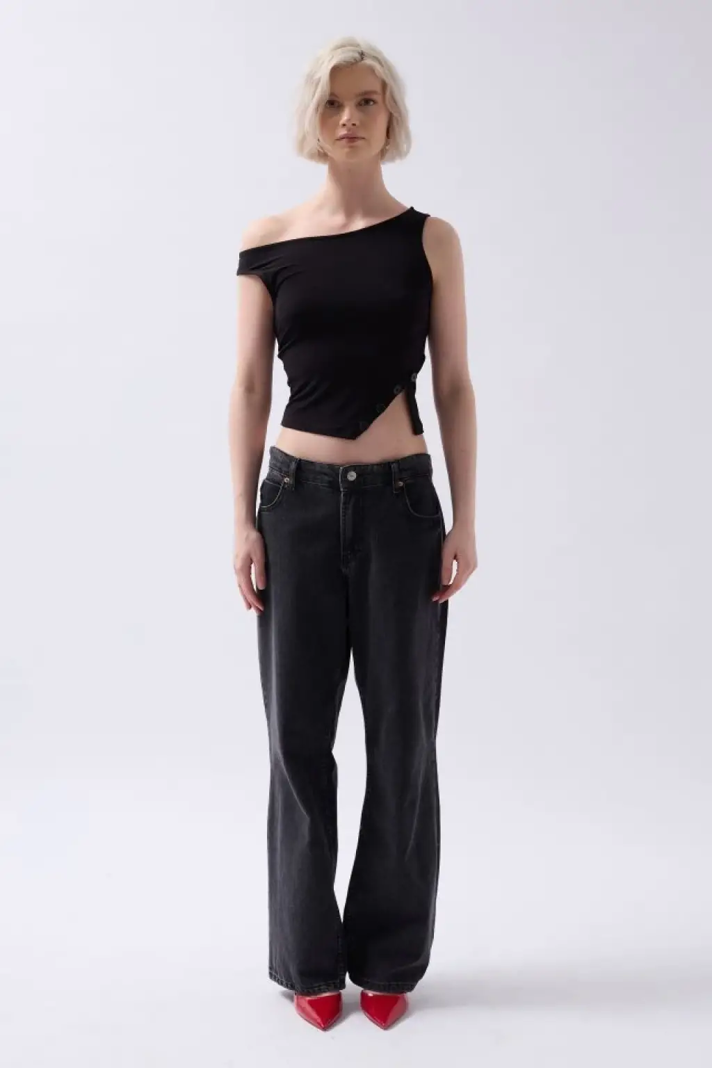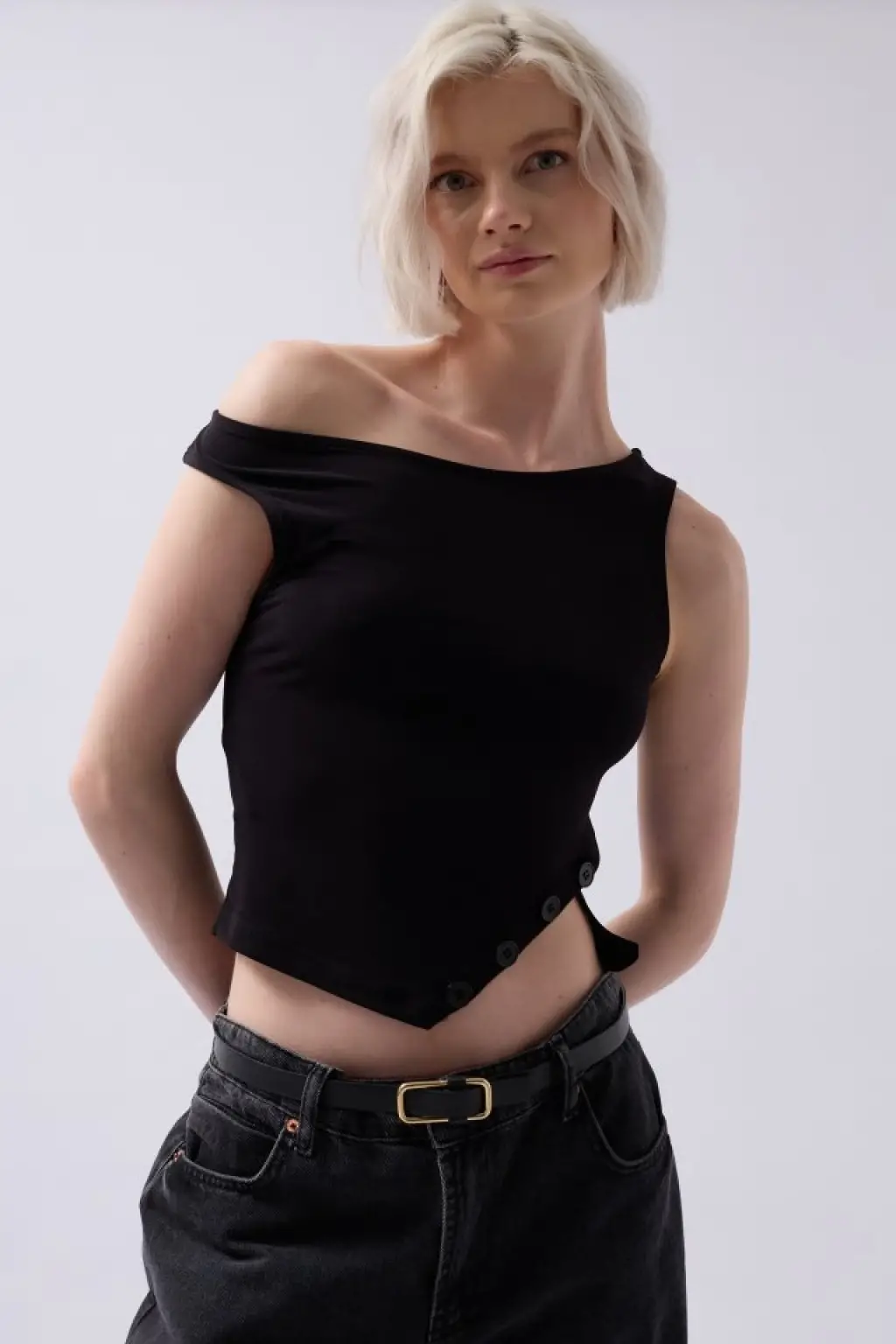 Kadın Tek Omuzu Açık Kısa Kollu Salaş Viskon Bluz