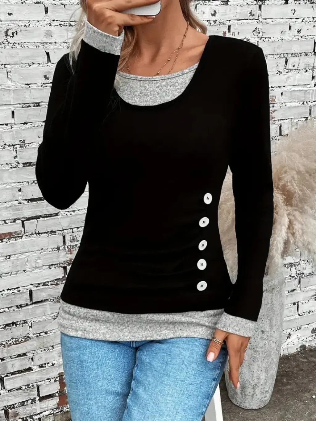 Kadın Uzun Kollu Yuvarlak Yaka Blok Renkli Yandan Düğmeli Viskon Bluz