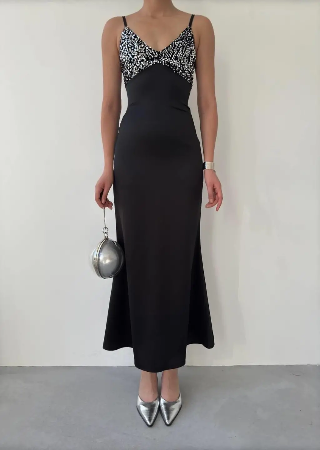 Kadın Viskon Kumaş İp Askılı Halter Yaka Cepli Midi Boy Elbise