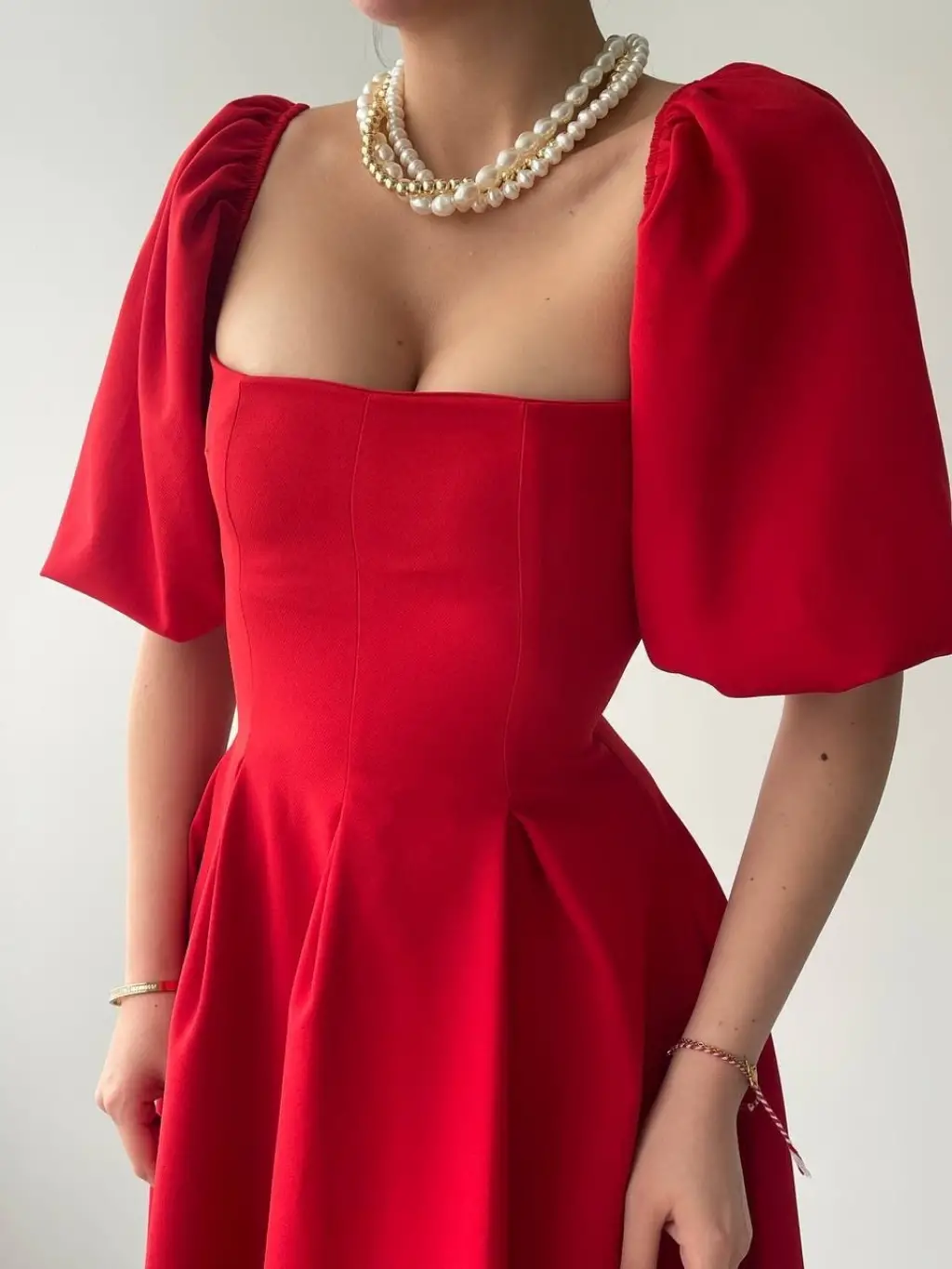 Kadın Kısa Kollu Madonna Yaka önü Kısa Arkası Uzun Ithal Krep Elbise