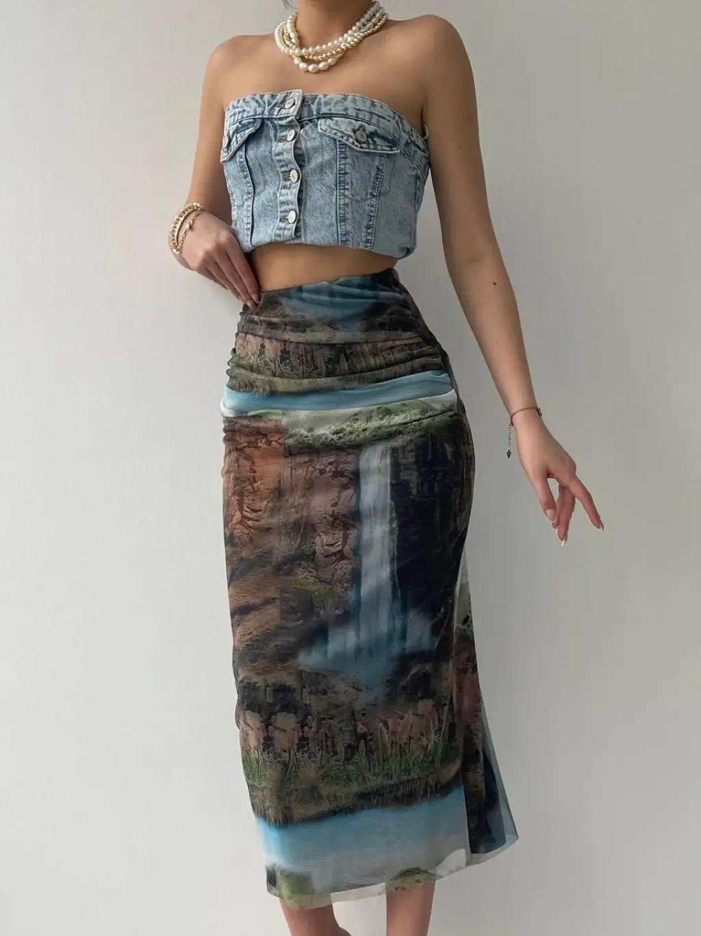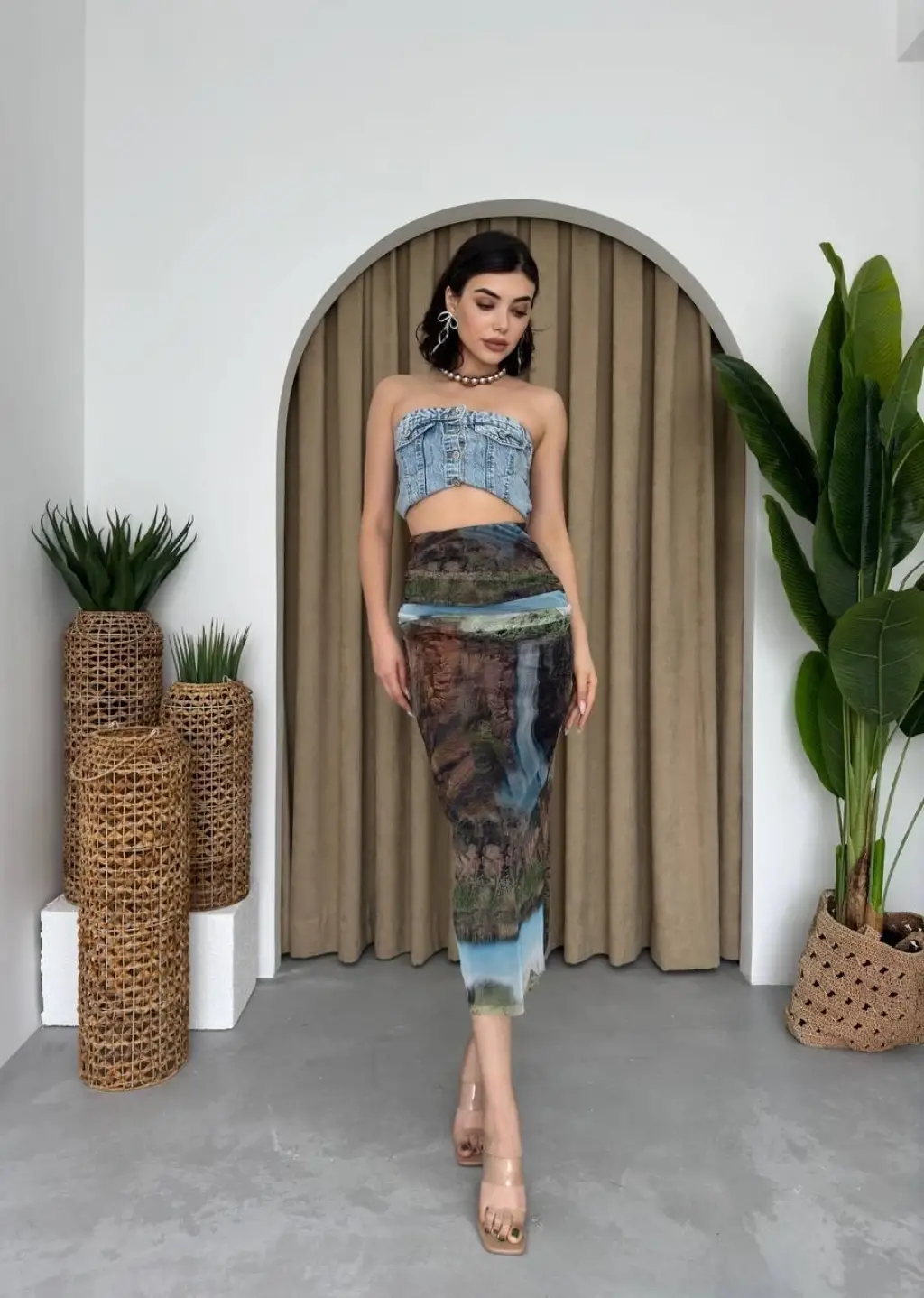 Kadın Kısa Kollu Mavi Sarı Kelebek Baskı Süprem Bluz