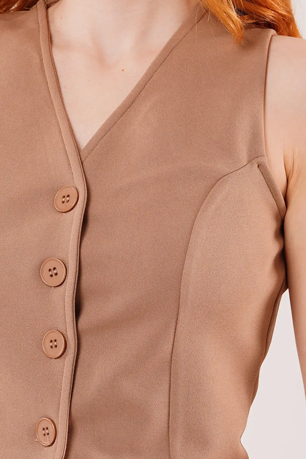 Kahverengi Düğmeli Keten Yelek Kadın Giyim