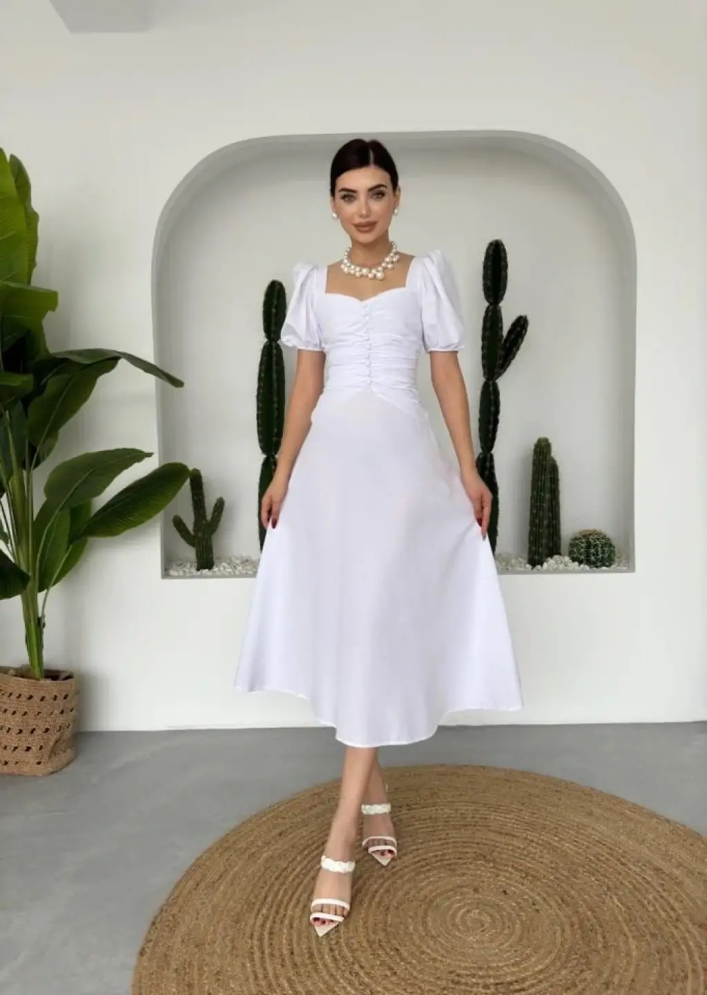 Kare Yaka Düğmeli Elbise