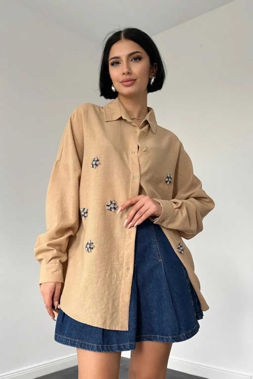 Kadın Uzun Kollu Salaş Gömlek Ve şort Keten Ikili Takım