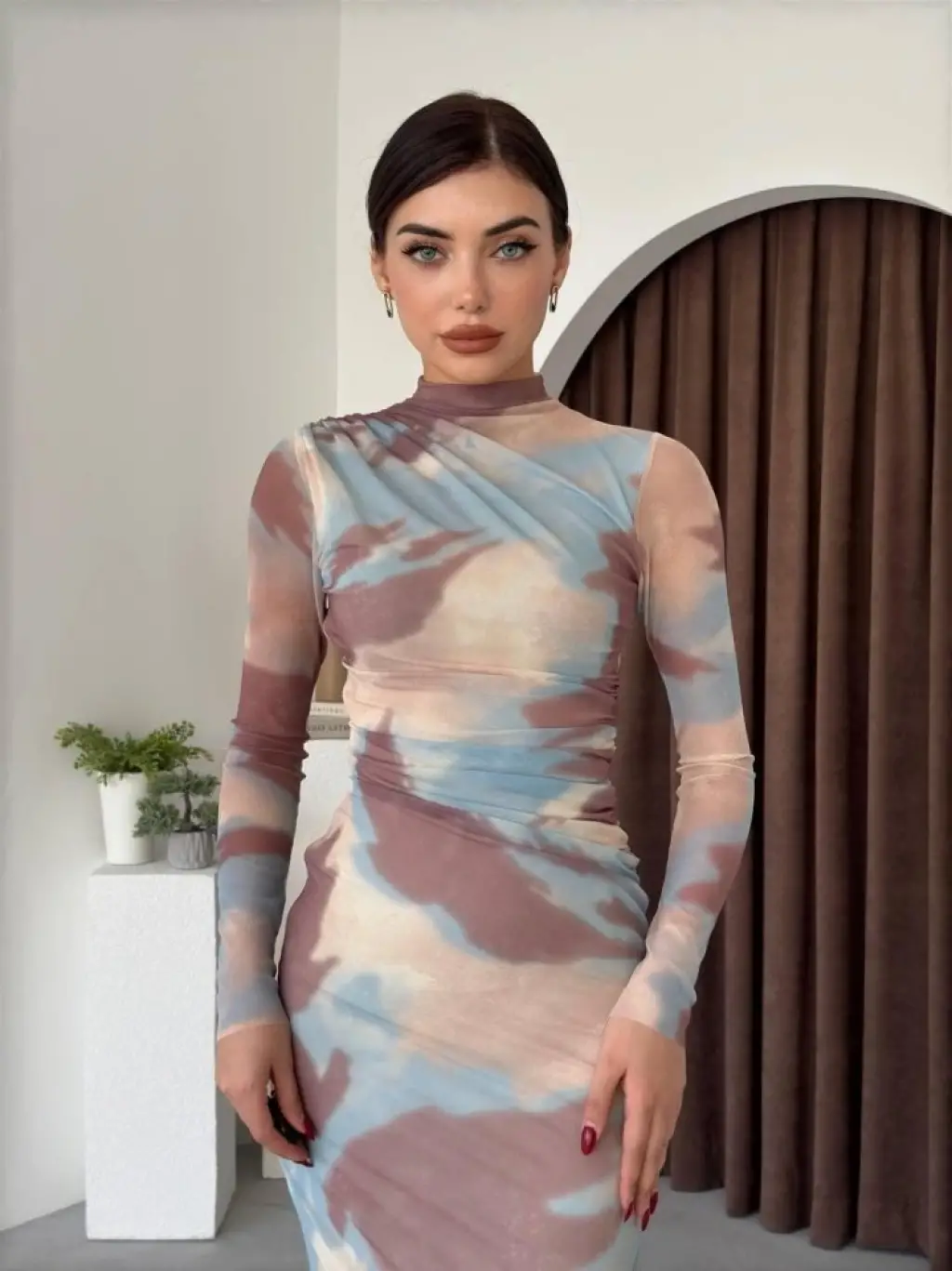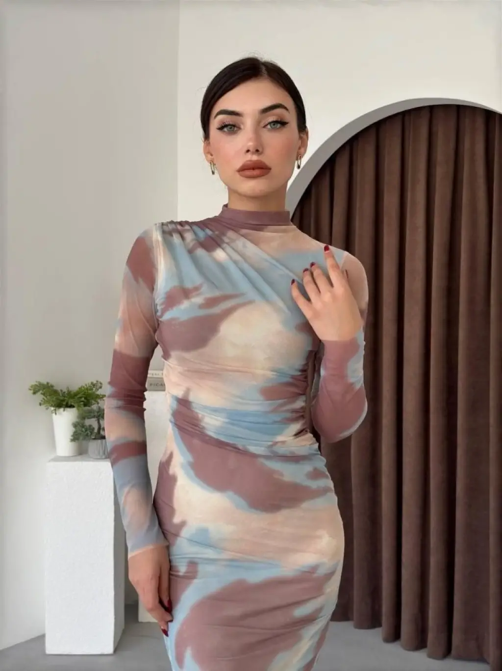 Kadın Uzun Kollu Bisiklet Yaka çapraz Büzgü Detay Iki Iplik Mini Boy Elbise