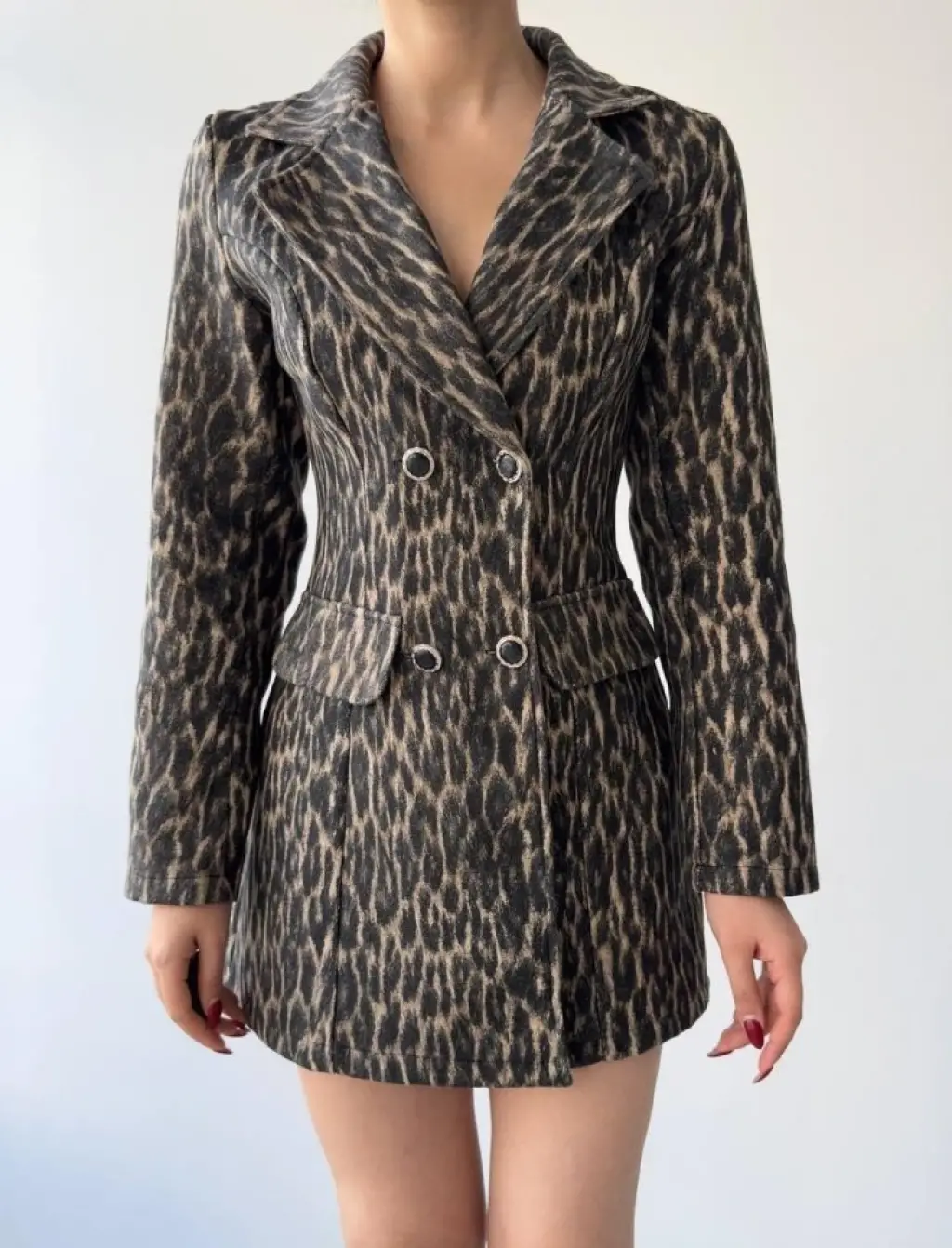 Kadın Bisiklet Yaka Kısa Kol Leopar Desen Bluz Ve Pantolon Ikili Takım