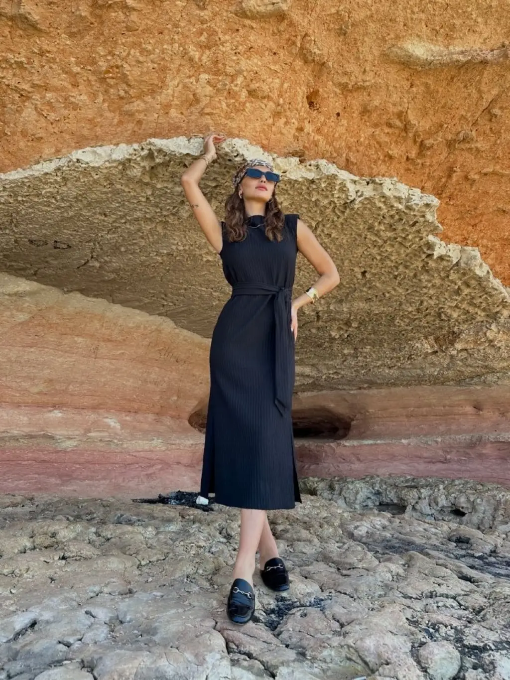 Kadın Ithal Krep Kumaş Kruvaze Yaka Eteği Kloş Kolsuz Mini Elbise