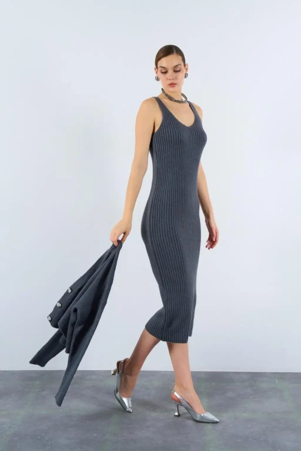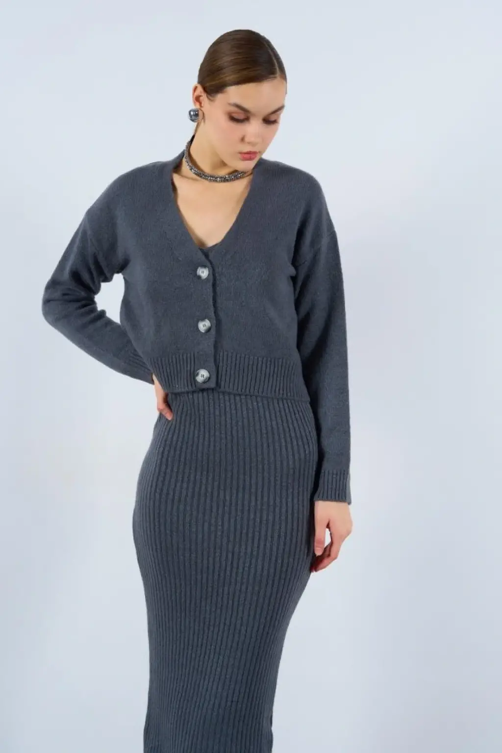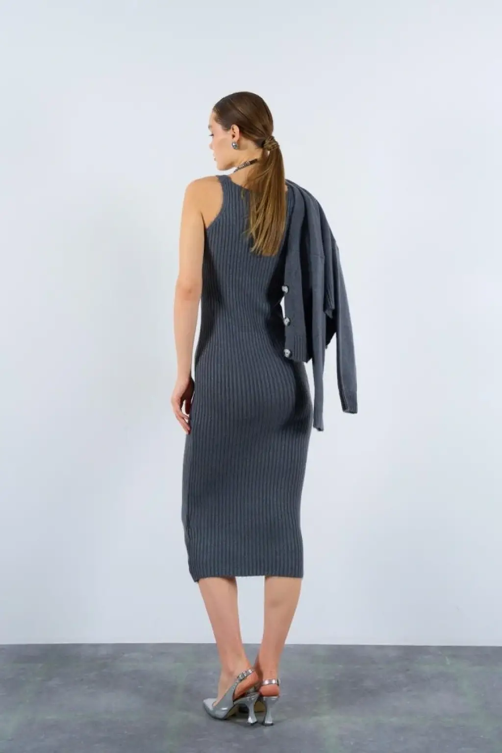 Fitilli Elbise Hırkalı Takım - Füme