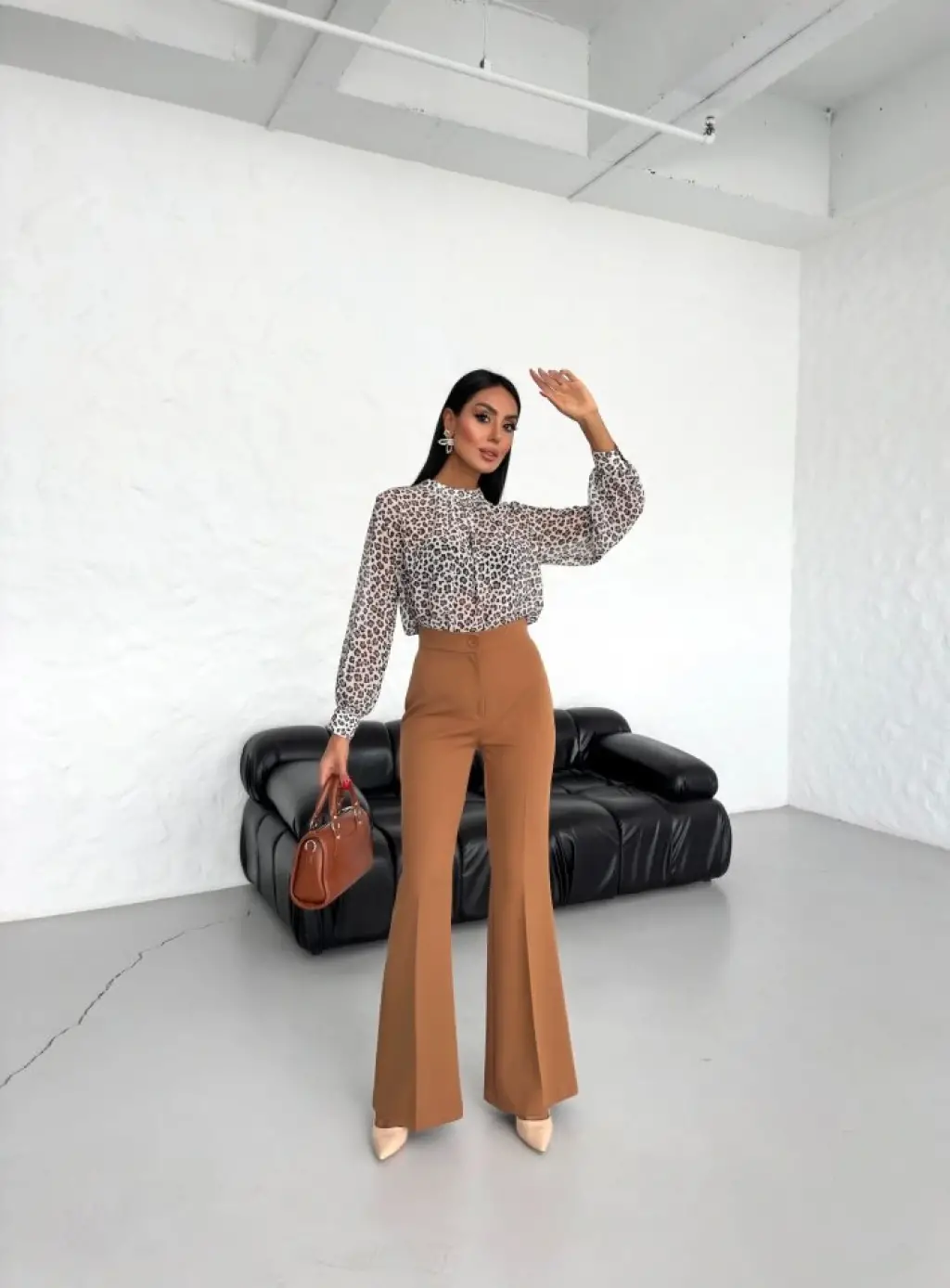 Kadın Uzun Kollu Yarı Balıkçı Yaka Leopar Detaylı Kaşkorse Bluz