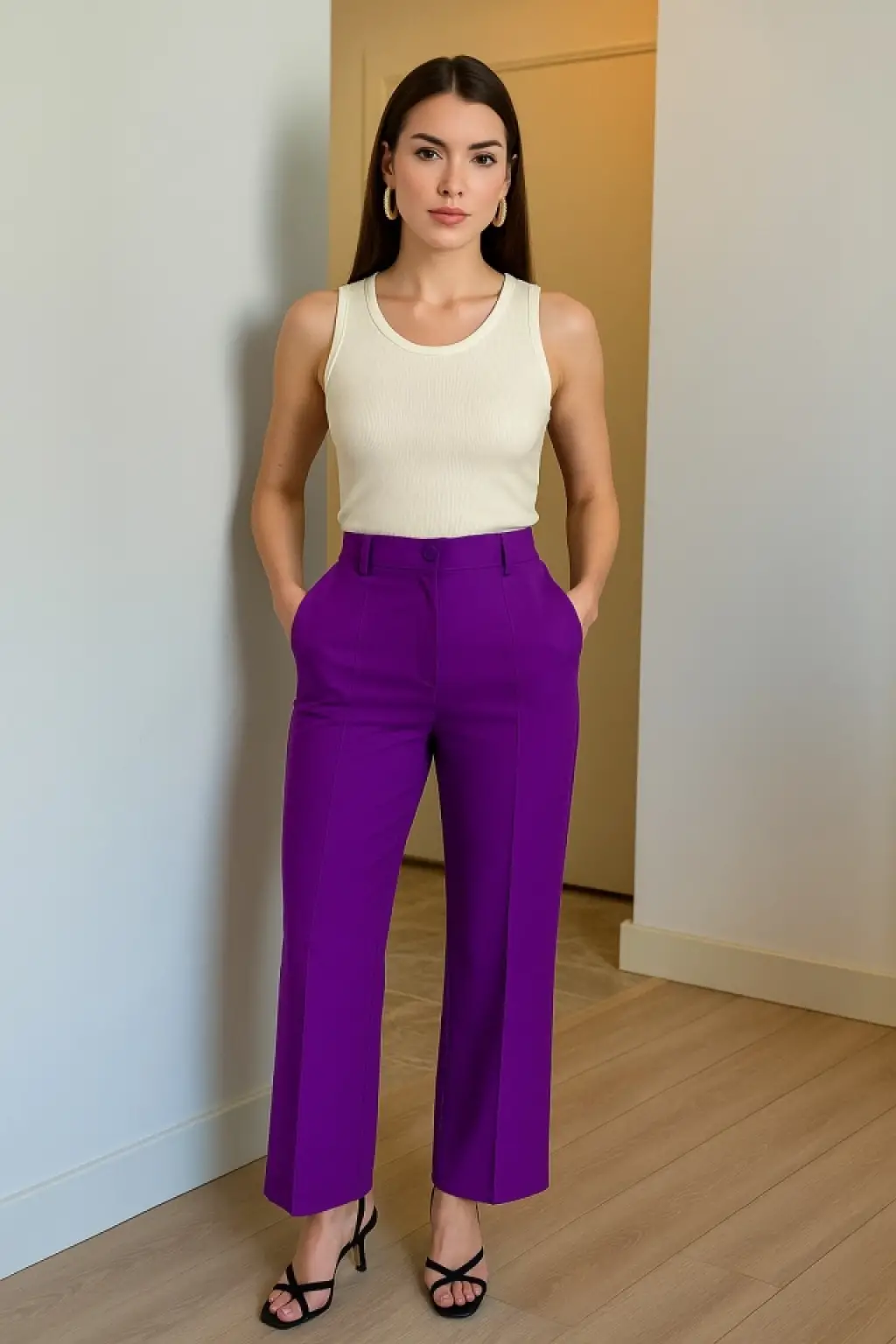 Kadın Yüksek Bel Geniş Paça Detaylı Cepli Ithal Krep Pantolon