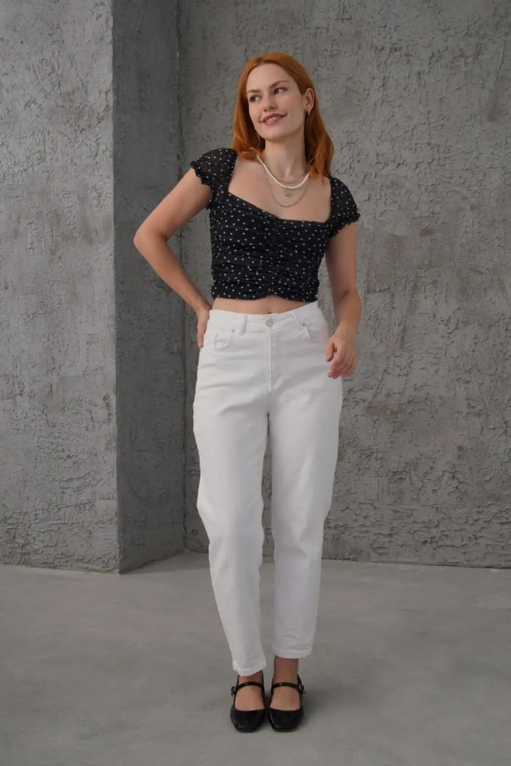 Puantiyeli Belden Oturtmalı Tül Siyah Bluz