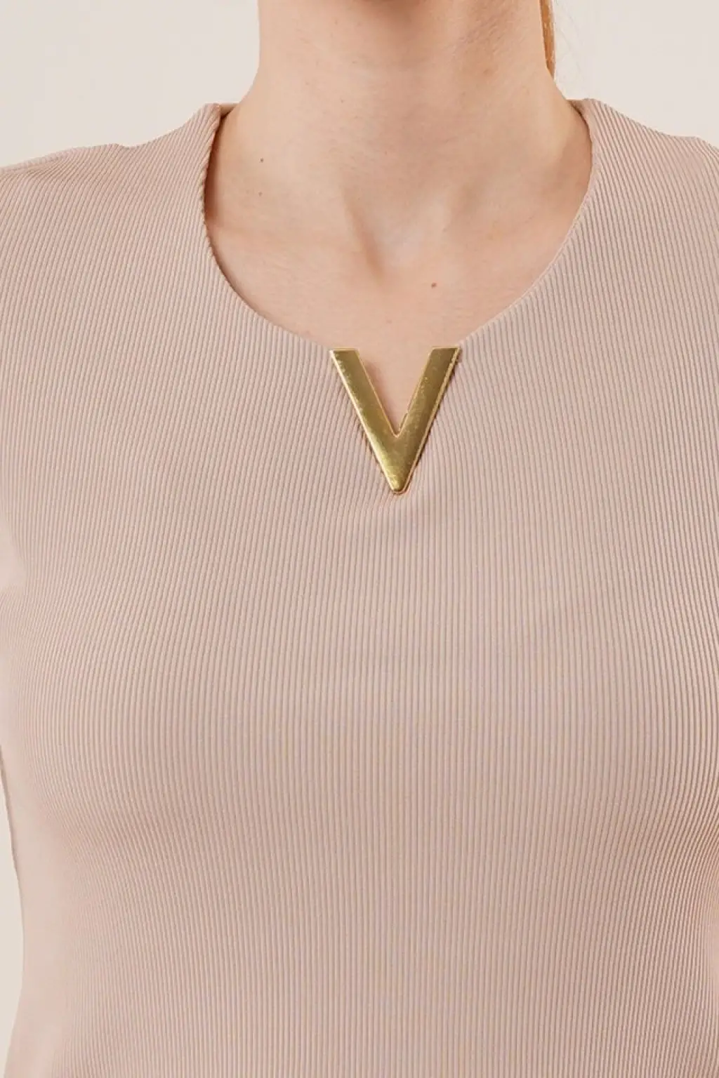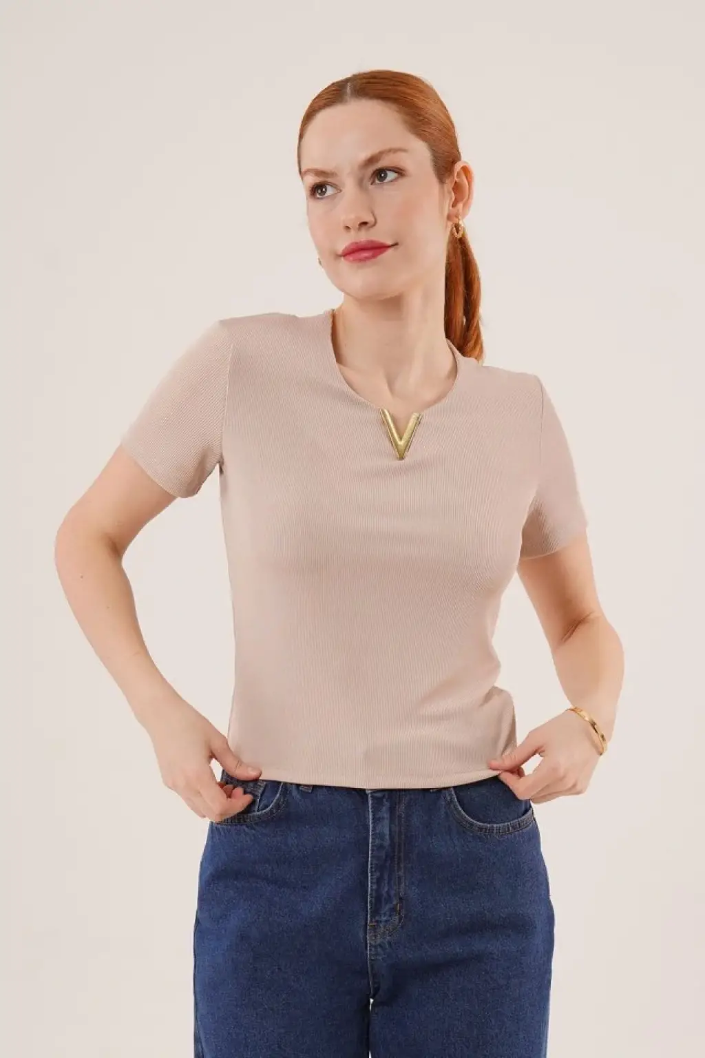 Kısa Kollu Yaka Detaylı Kaşkorse Taş Bluz