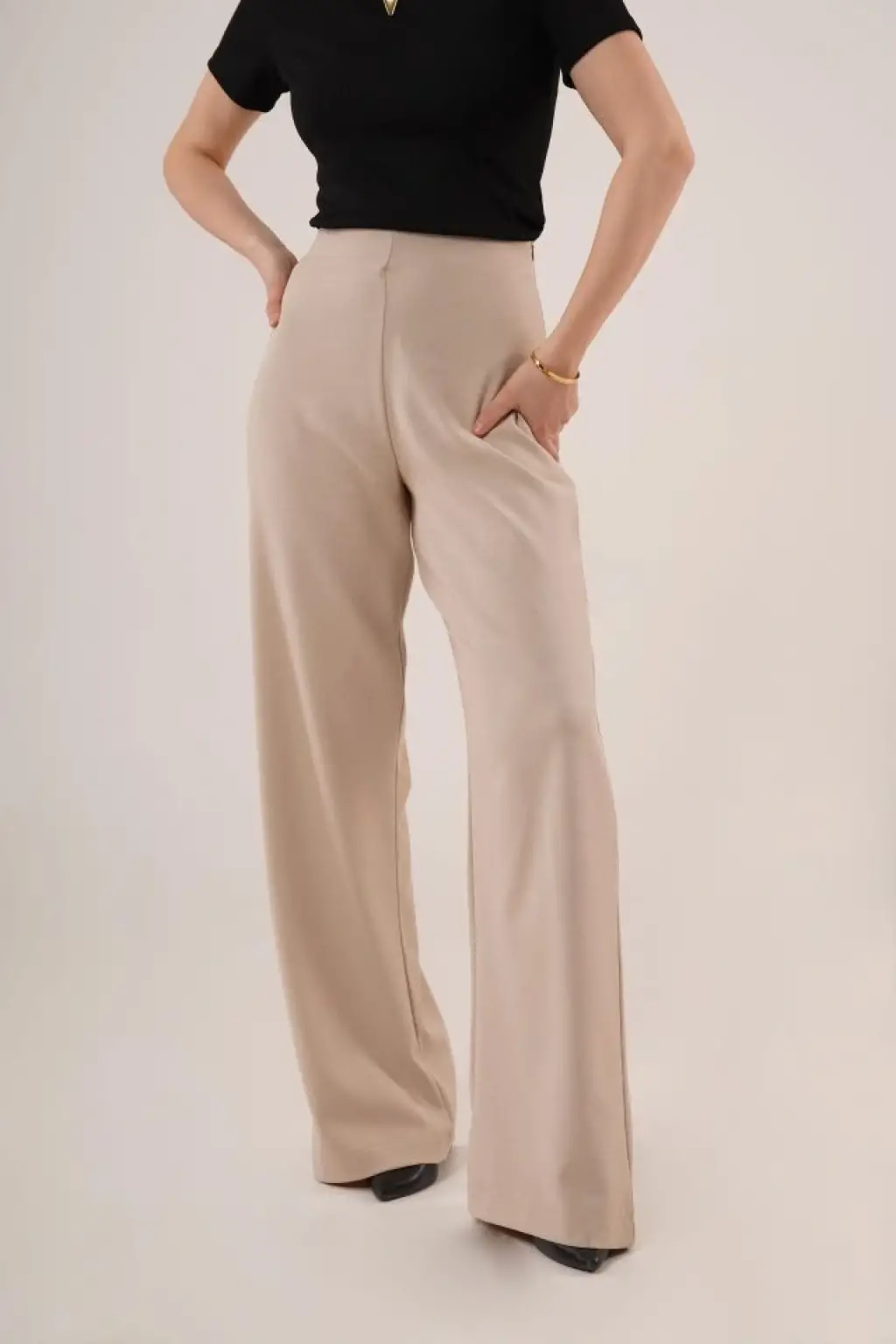 Bol Paça Yandan Fermuarlı Krem Kumaş Pantolon