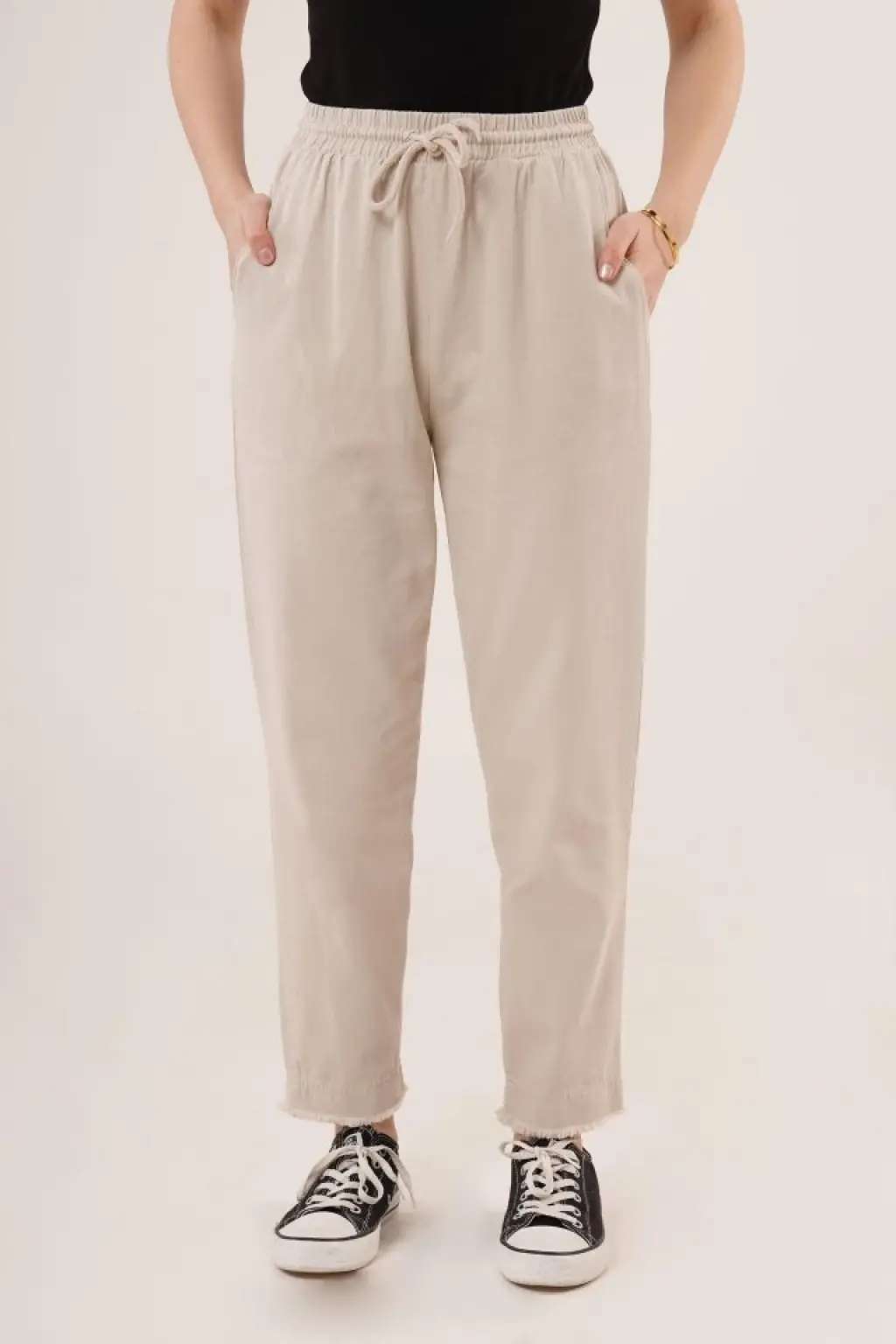 Cepli Belden Bağlamalı Paça Detaylı Krem Pantolon