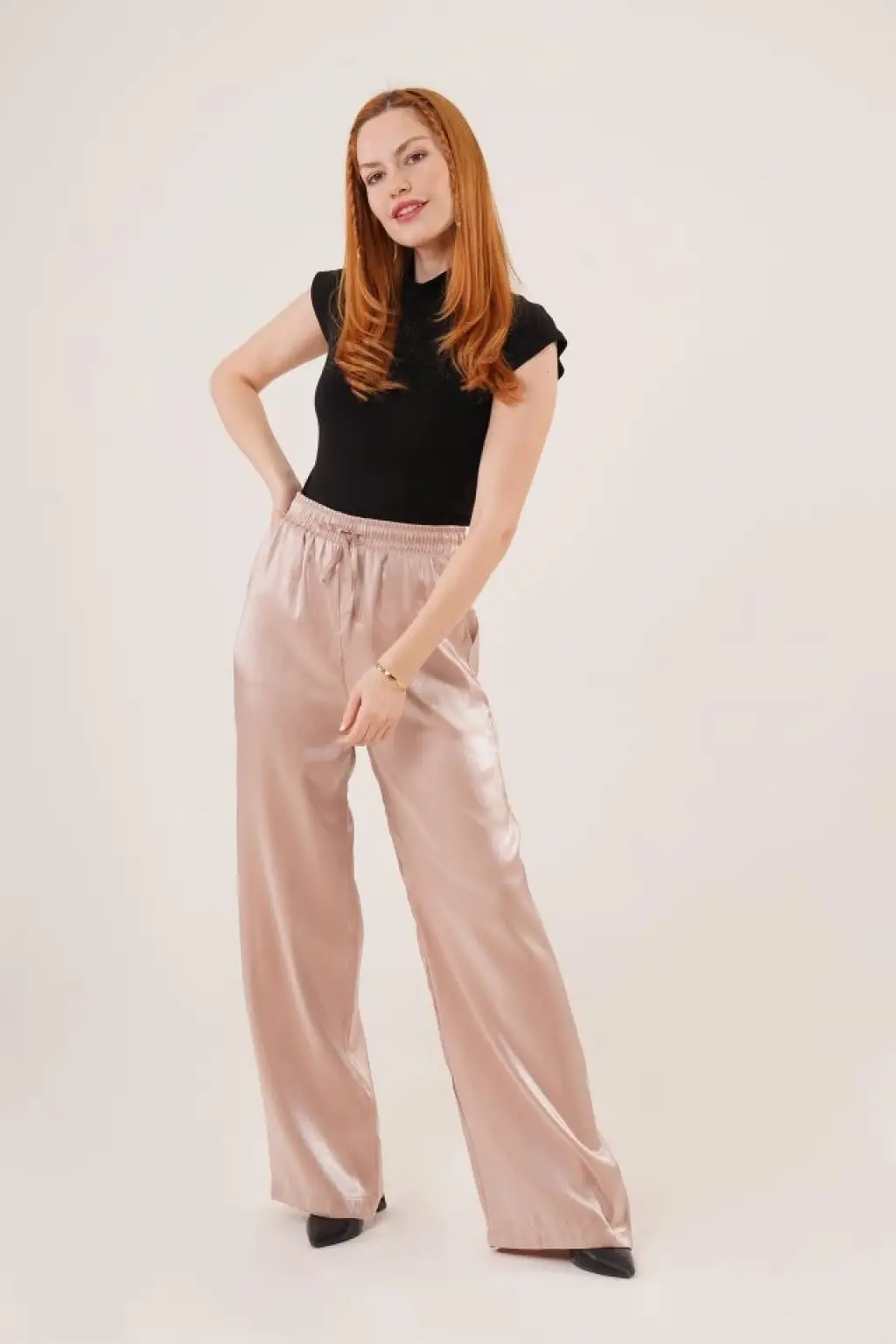 Parlak Görünümlü Cepli Bej Bol Paça Pantolon