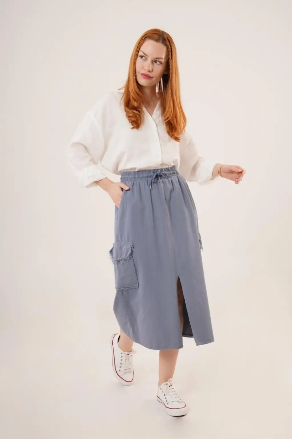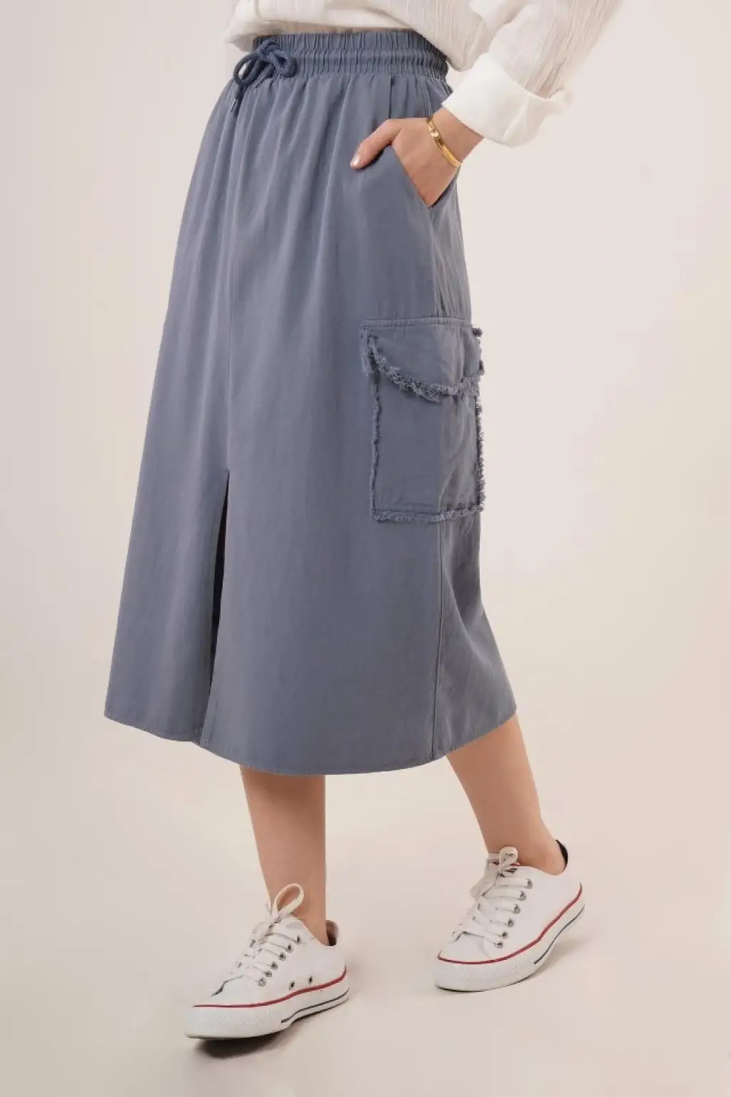 Ön Yırtmaçlı Cep Detaylı İndigo Etek