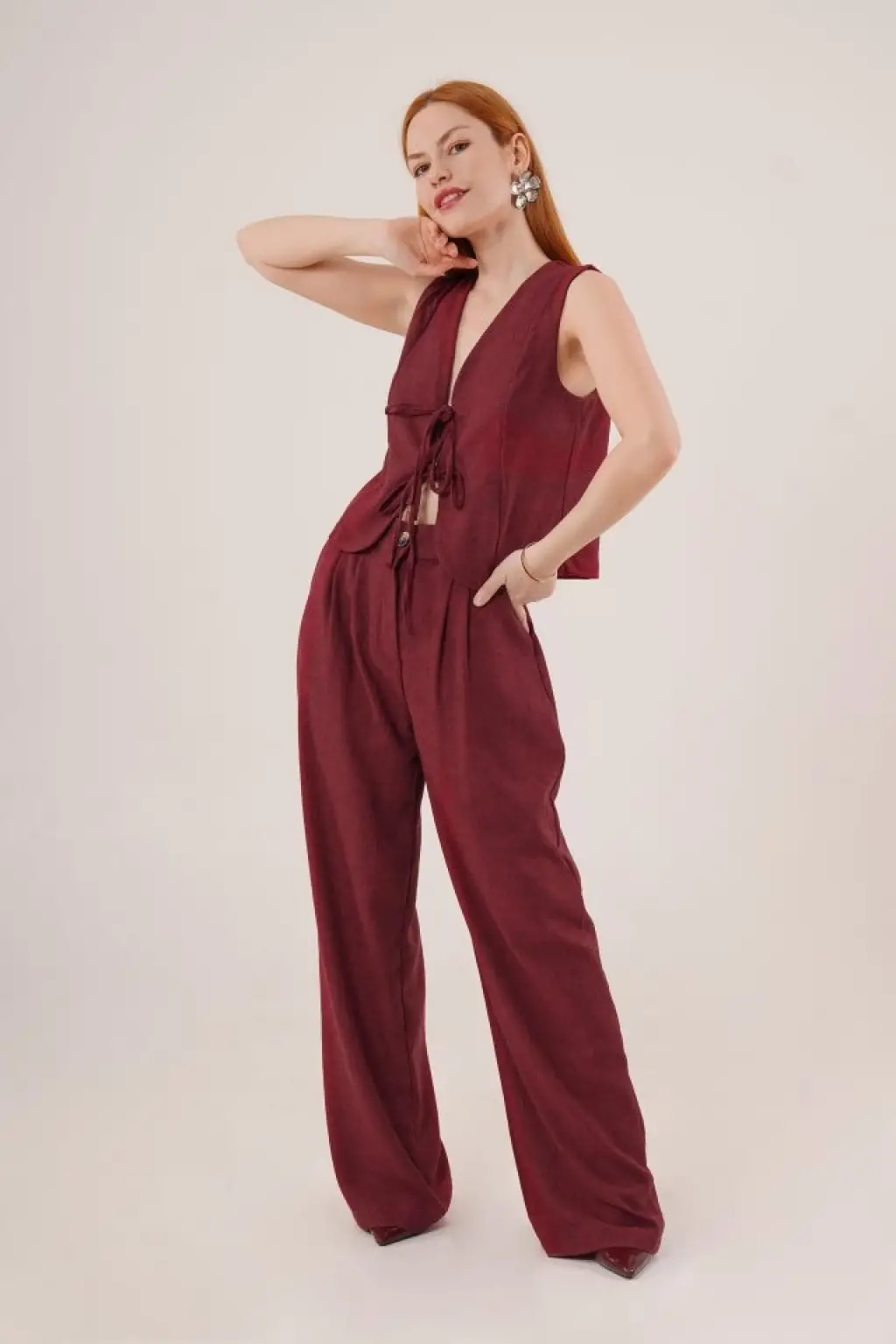 Ön Bağlama Detaylı Yelek Ve Pantolon Bordo İkili Takım