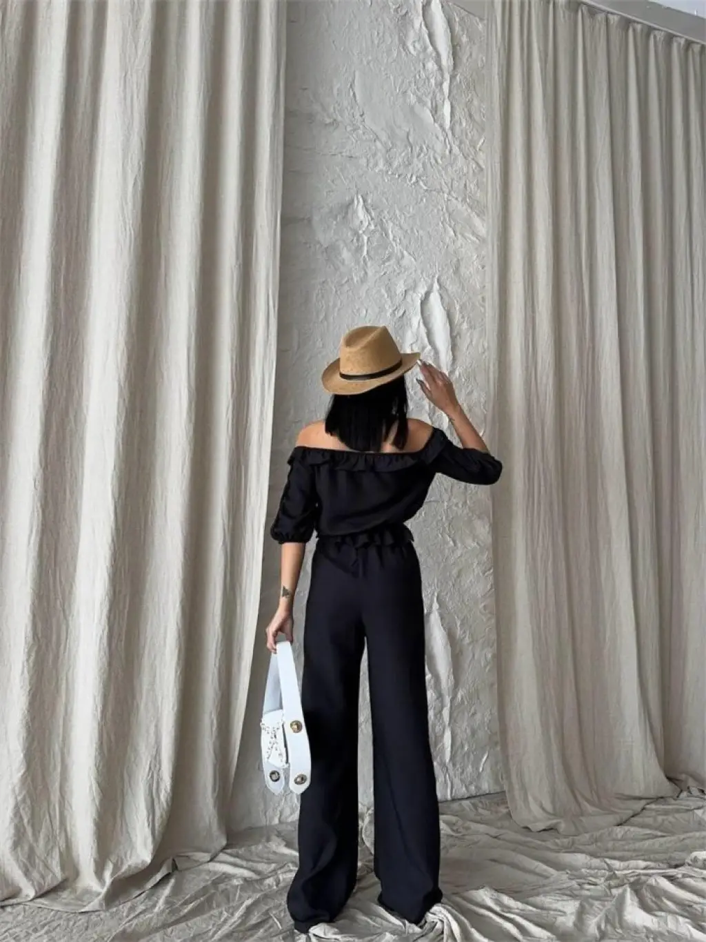 KETEN MADONNA YAKA KOL HASIR ŞERİT - PANTOLON TAKIM - Siyah